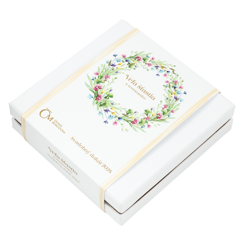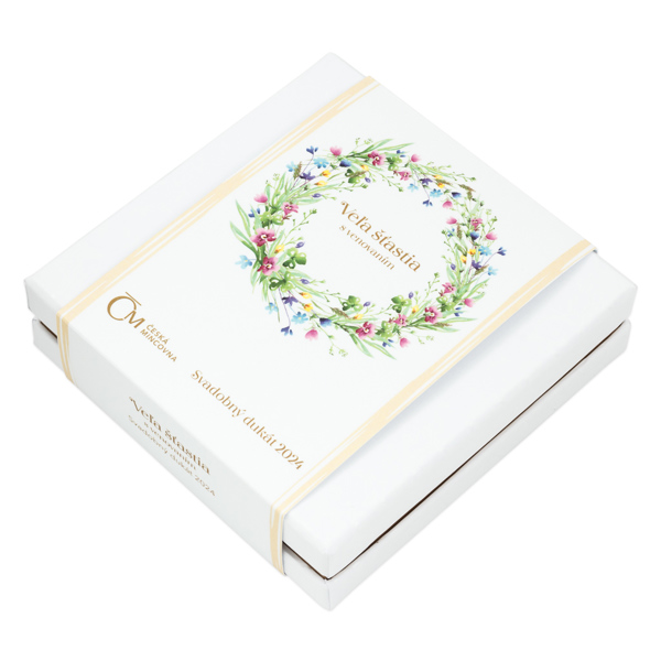 Zlatý svatební dukát České mincovny s ročníkem 2024 ve slovenské verzi je vkusným darem pro novomanžele, který v sobě spojuje originální symboliku, hodnotu drahého kovu a citovou hodnotu v podobě vyrytého věnování.