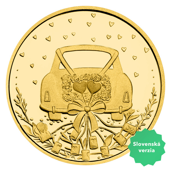 Takový je i zlatý dukát České mincovny, jehož autorkou se stala medailérka Ludmila Kracíková, DiS. Averzní stranu věnovala svatebnímu autu ozdobenému stužkami, květinami, balónky i plechovkami, jejichž rachot odežene zlé duchy a zajistí, aby ženicha s nevěstou nikdo nepřehlédl. Reverzní strana je pak vyhrazena pro vyrytí textu, který může mít podobu osobního vzkazu, jmen novomanželů, data svatby, … – fantazii se meze nekladou. Jediným limitem je rozsah textu.