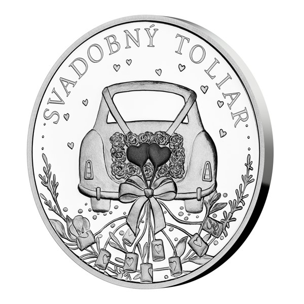 Svatební auto ozdobené stužkami, květinami, balónky a plechovkami najdete na averzní straně stříbrného tolaru, který je dílem medailérky Ludmily Kracíkové, DiS. Kompozici averzu dotváří opis SVADOBNÝ TOLIAR. Auto najdete i na reverzní straně. V kufru veze dva prstýnky a na střeše mu sedí dva zamilovaní ptáčci – nevěsta se závojem a ženich s cylindrem.
