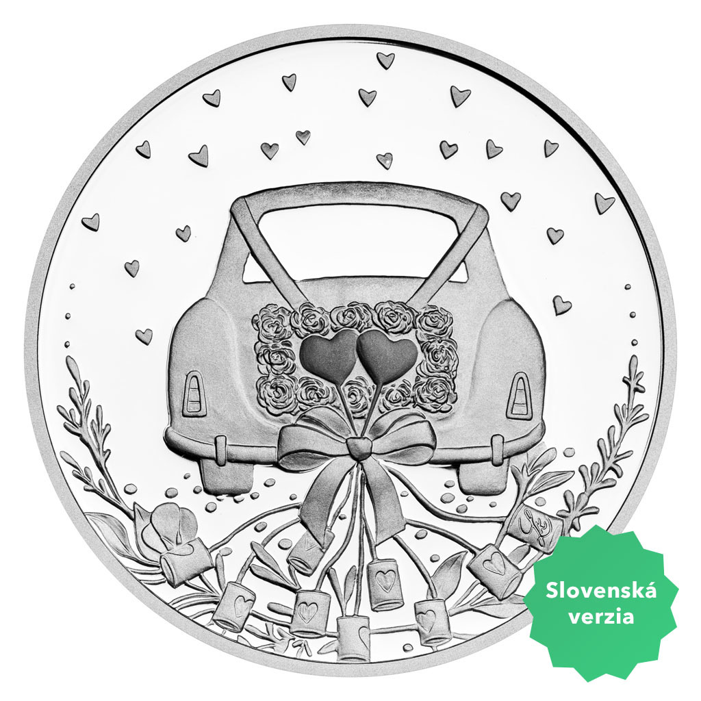 Svatební auto ozdobené stužkami, květinami, balónky a plechovkami najdete na averzní straně stříbrného tolaru, který je dílem medailérky Ludmily Kracíkové, DiS. Auto najdete i na reverzní straně. V kufru veze dva prstýnky a na střeše mu sedí dva zamilovaní ptáčci – nevěsta se závojem a ženich s cylindrem.