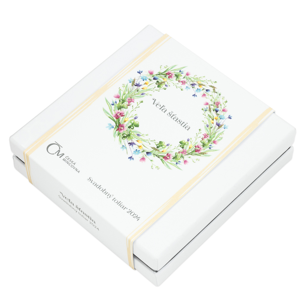 Dárkové balení obsahuje vedle tolaru také certifikát pravosti s prostorem pro vepsání osobního věnování. Nepřehlédněte ani další varianty svatebního penízku – v naší nabídce na rok 2024 najdete dva různé drahé kovy i verze, na které lze vyrýt věnování.