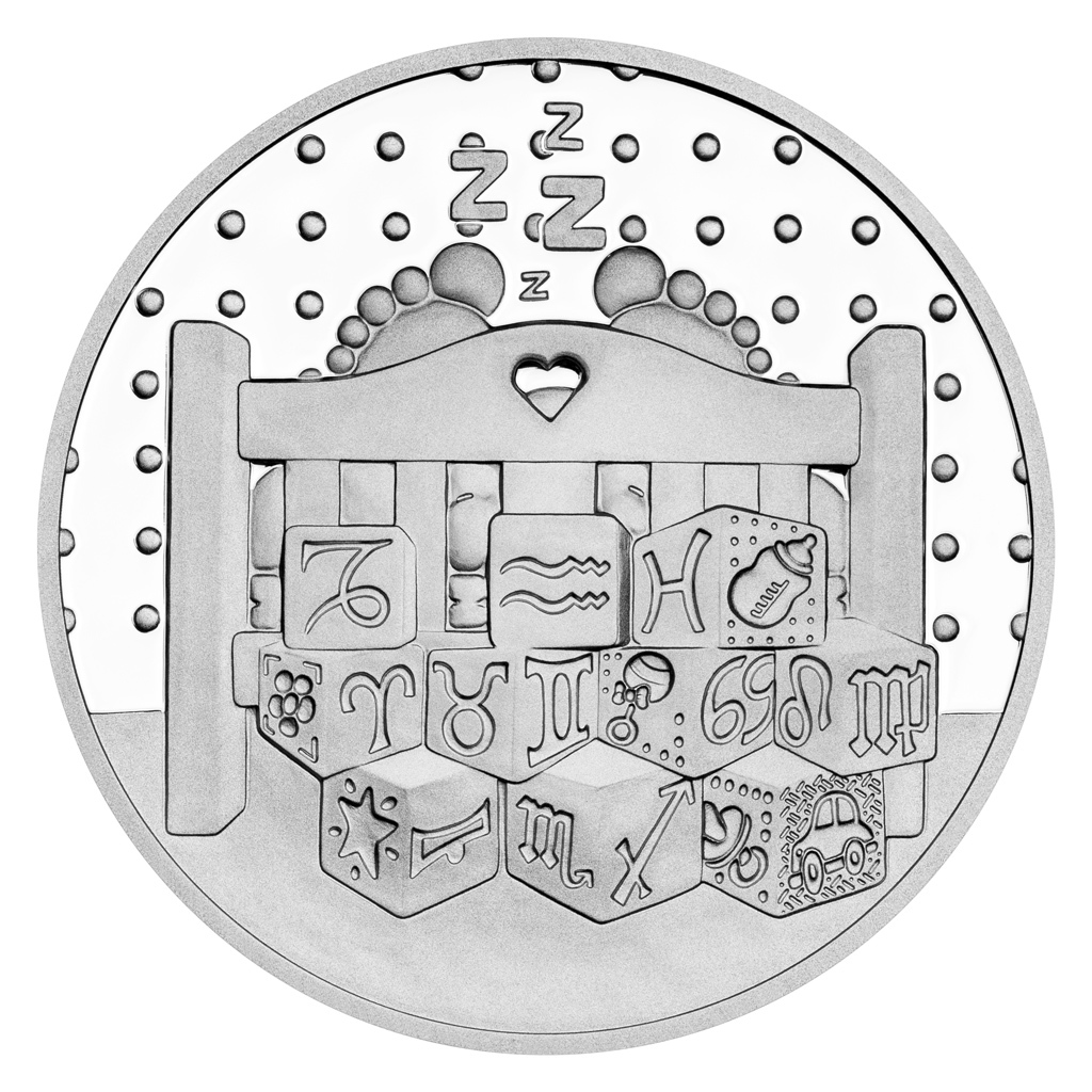 Medailér Petr Patka, DiS., věnoval averzní stranu stříbrného tolaru roztomilému miminku, které si hraje s kostkami. Hra ho natolik unavila, že na reverzní straně už spokojeně spí.