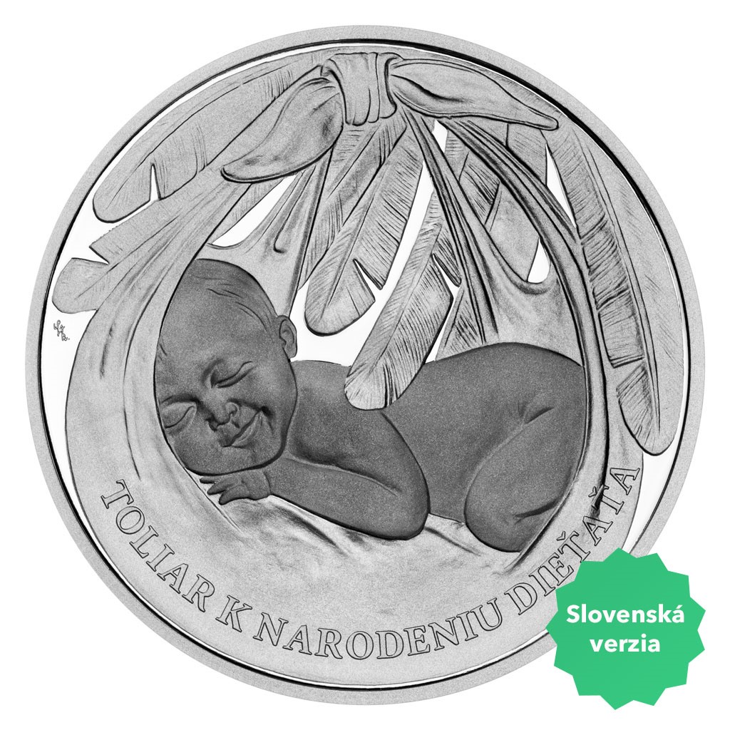 Čápovi, který v zobáku nese uzlíček, věnovala medailérka Lenka Nebeská, DiS., reverzní stranu stříbrného tolaru. Averzní strana pak předkládá miminko, které spí v šátku, a opis TOLIAR K NARODENIU DIEŤAŤA.