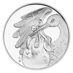 Čápovi, který v zobáku nese uzlíček, věnovala medailérka Lenka Nebeská, DiS., reverzní stranu stříbrného tolaru. Averzní strana pak předkládá miminko, které spí v šátku.