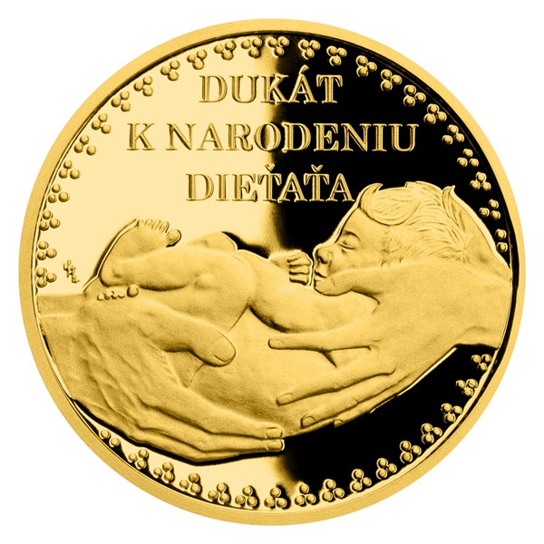 Autorkou výtvarného námětu zlatého dukátu je nadaná medailérka Lenka Nebeská, DiS. Na averzní stranu umístila spící miminko, které drží v dlaních jeho rodiče, a nápis DUKÁT K NARODENIU DIEŤAŤA. Reverzní strana pak patří tradiční dětské hračce – houpacímu koníkovi.