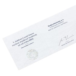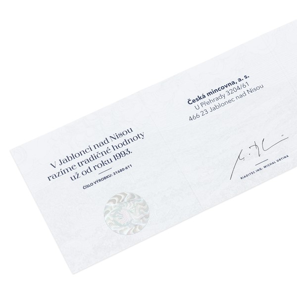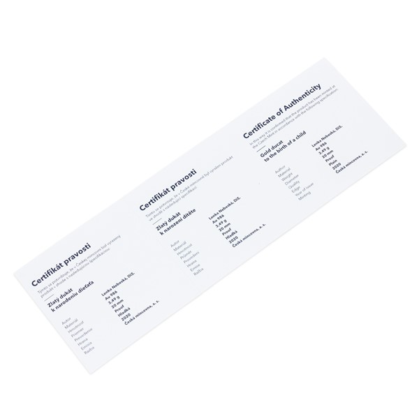 Dukát je zabalen do dárkové krabičky spolu s certifikátem pravosti.