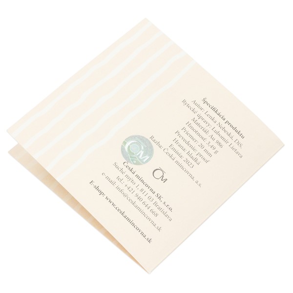 Medailérka Lenka Nebeská, DiS., věnovala averzní stranu zlatého dukátu spícímu miminku, které drží v dlaních jeho rodiče, a nápisu DUKÁT K NARODENIU DIEŤAŤA. Reverzní strana je pak vyhrazena pro vyrytí textu, který může mít podobu osobního vzkazu, jména, data narození, … – fantazii se meze nekladou. Jediným limitem je rozsah textu.