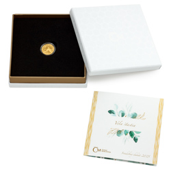 Srdečné věnování můžete vepsat i do certifikátu pravosti, který je součástí dárkového balení. Nepřehlédněte ani další varianty svatebního penízku – v naší nabídce na rok 2025 najdete dva různé drahé kovy i varianty bez vyrytého věnování.