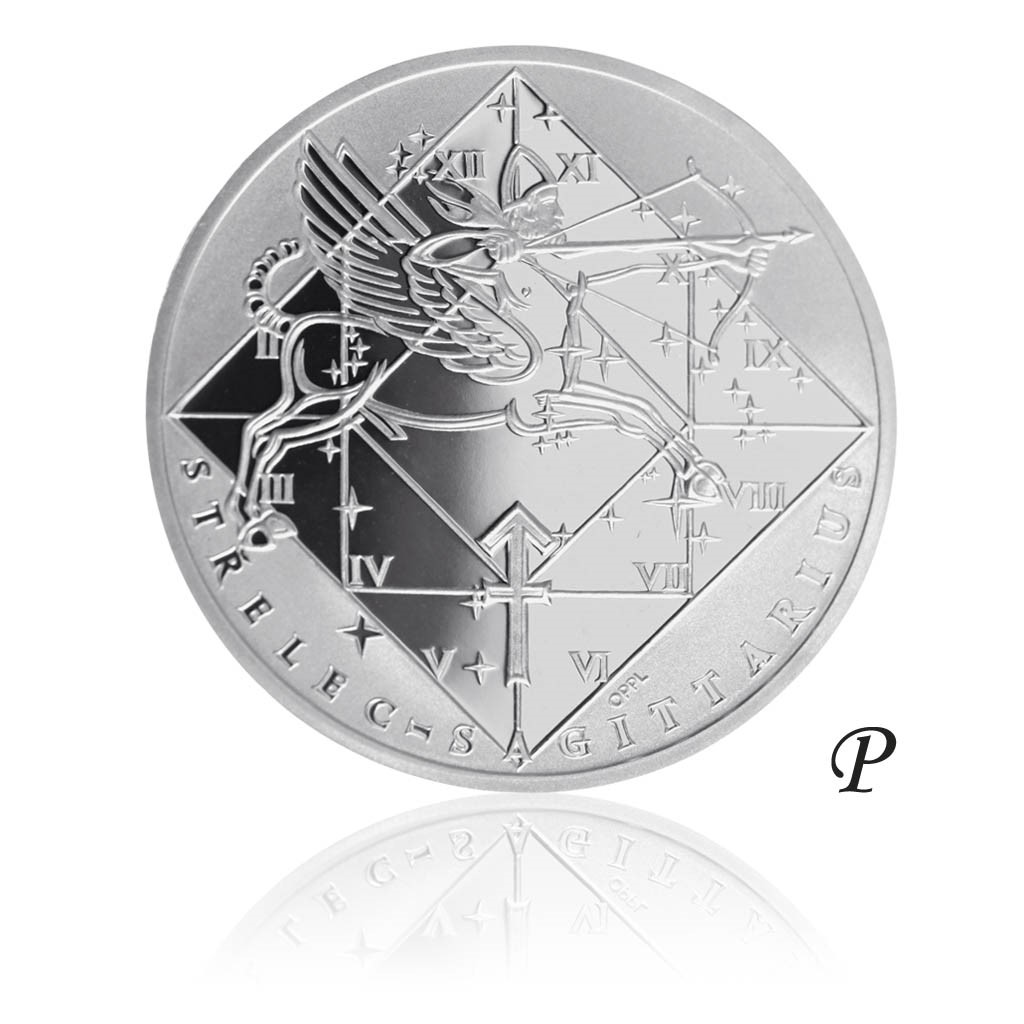 Střelec, latinsky Sagittarius, 23. listopadu až 21. prosince. Ohnivé znamení s vedoucí planetou Jupiter. Šťastným kovem je cín, rostlinou jasan a dnem čtvrtek. Na straně s jednotlivými znameními umístěnými v leštěném kosočtverci používaném astrology je umístěno nejen znamení, ale i jeho značka, český a latinský nápis. Hvězdičky svým rozestavením odpovídají příslušnému souhvězdí na obloze. Na averzní straně se nachází kompozice s motivem střelce, doplněna jeho souhvězdím. Na reverzní stranu s dekorem po obvodu je možno vygravírovat věnování nebo přenést fotografii.