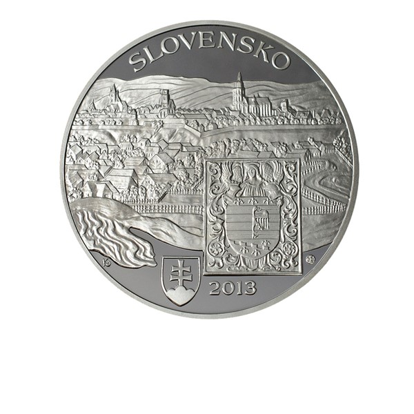Na averzní straně mince je ústředním motivem výřez veduty od G. Houfnagela z roku 1617 doplněný historickým erbem města, který společně se státním znakem dotváří ucelenou kompozici.