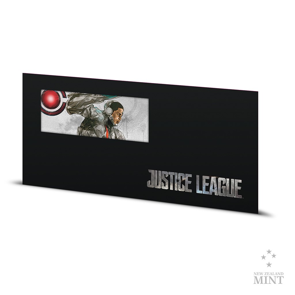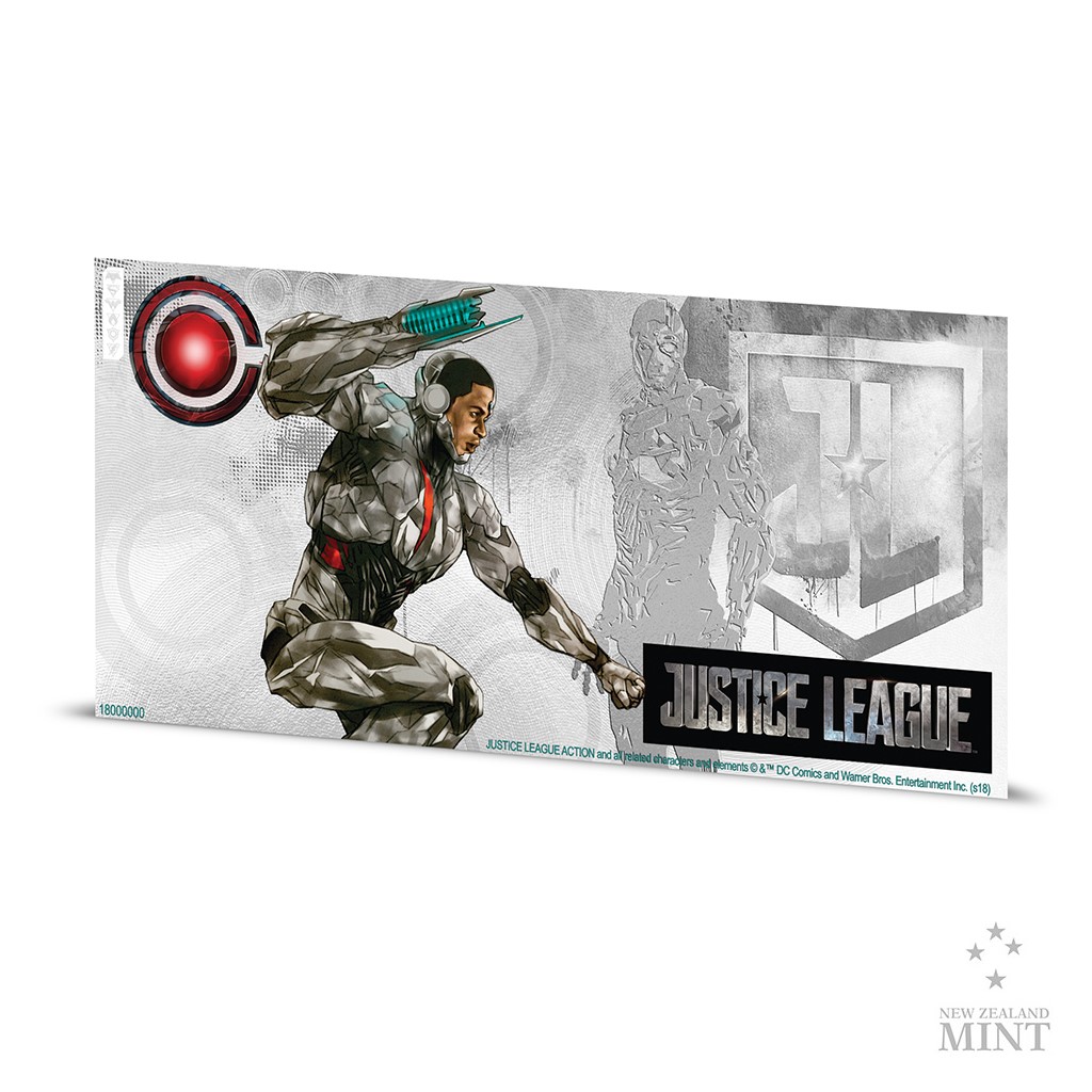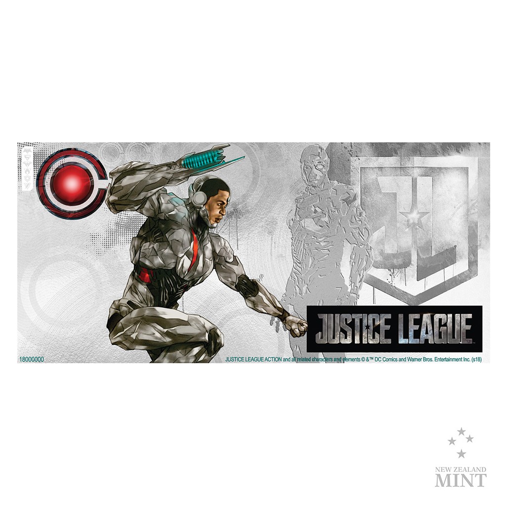 Reverzní strana „bankovky“, která vznikla v Novozélandské mincovně, předkládá dvě vyobrazení Cyborga inspirovaná jeho filmovou podobou – jedno je kolorované a druhé má podobu rytiny – spolu se symbolem v podobě písmena C a logem JUSTICE LEAGUE. Averz pak nese nezbytné atributy emitenta, kterým je ostrov Niue – tedy jméno a portrét královny Alžběty II., nominální hodnotu ONE DOLLAR (NZD) a rok emise 2018.