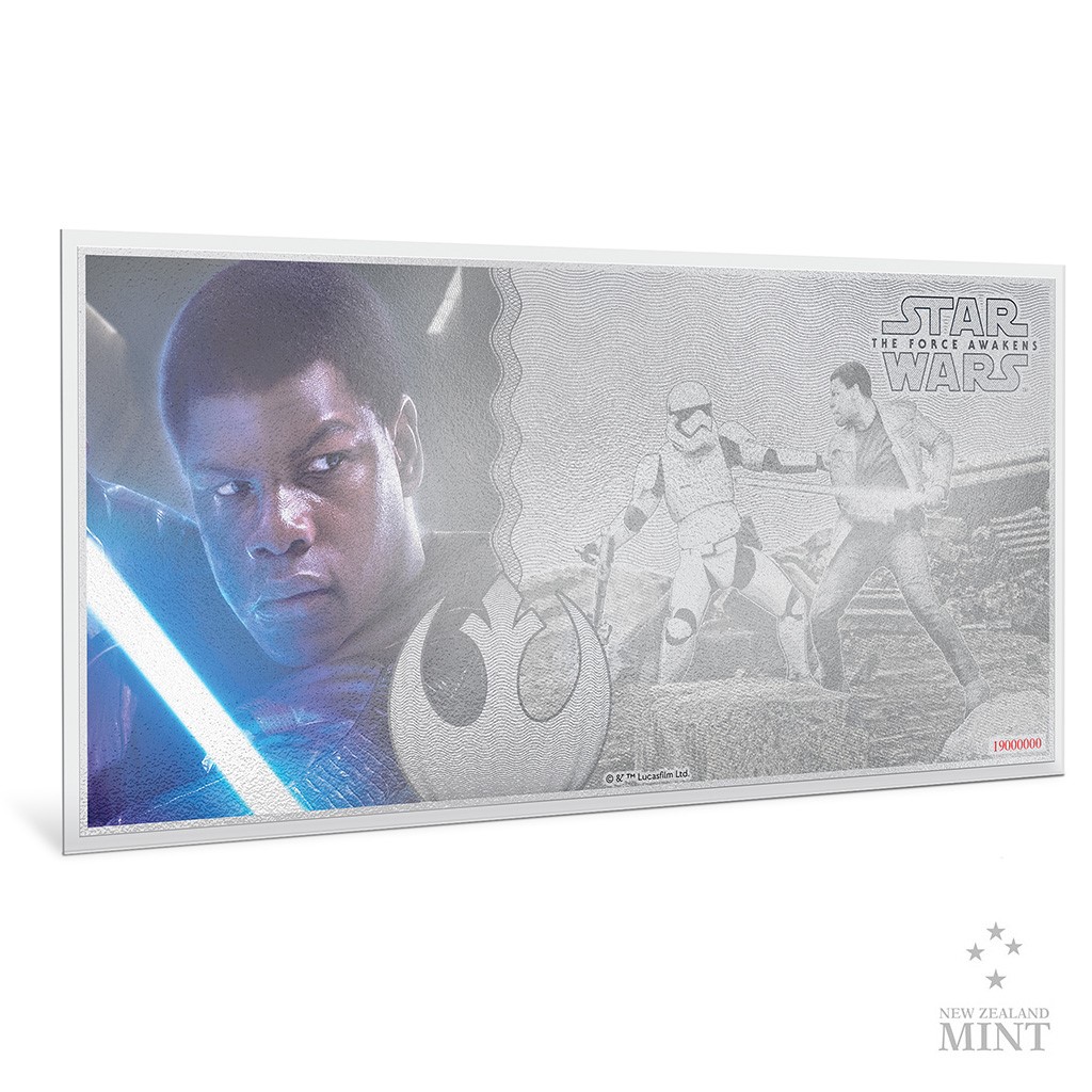 Sedmá epizoda Hvězdných válek s podtitulem Síla se probouzí zahájila novou kapitolu zbožňované filmové ságy. Její postavy, mezi kterými nechybí Finn, se objevují na speciálních mincích v podobě bankovek vyrobených ze stříbra.