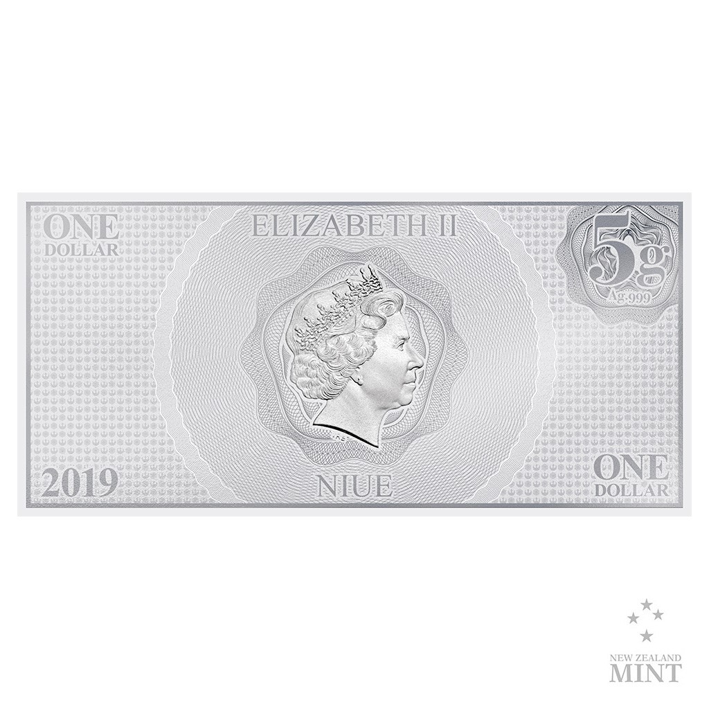 Na reverzní straně „bankovky“, která vznikla v Novozélandské mincovně, je Finn vyobrazen hned dvakrát – první portrét (se světelným mečem) je kolorovaný a druhý (ve společnosti stormtroopera Prvního řádu) má podobu rytiny. V reliéfu se vyjímá ještě insignie Odboje Nové republiky. Averz pak nese nezbytné atributy emitenta, kterým je ostrov Niue – tedy jméno a portrét královny Alžběty II., nominální hodnotu ONE DOLLAR (NZD) a rok emise 2019.