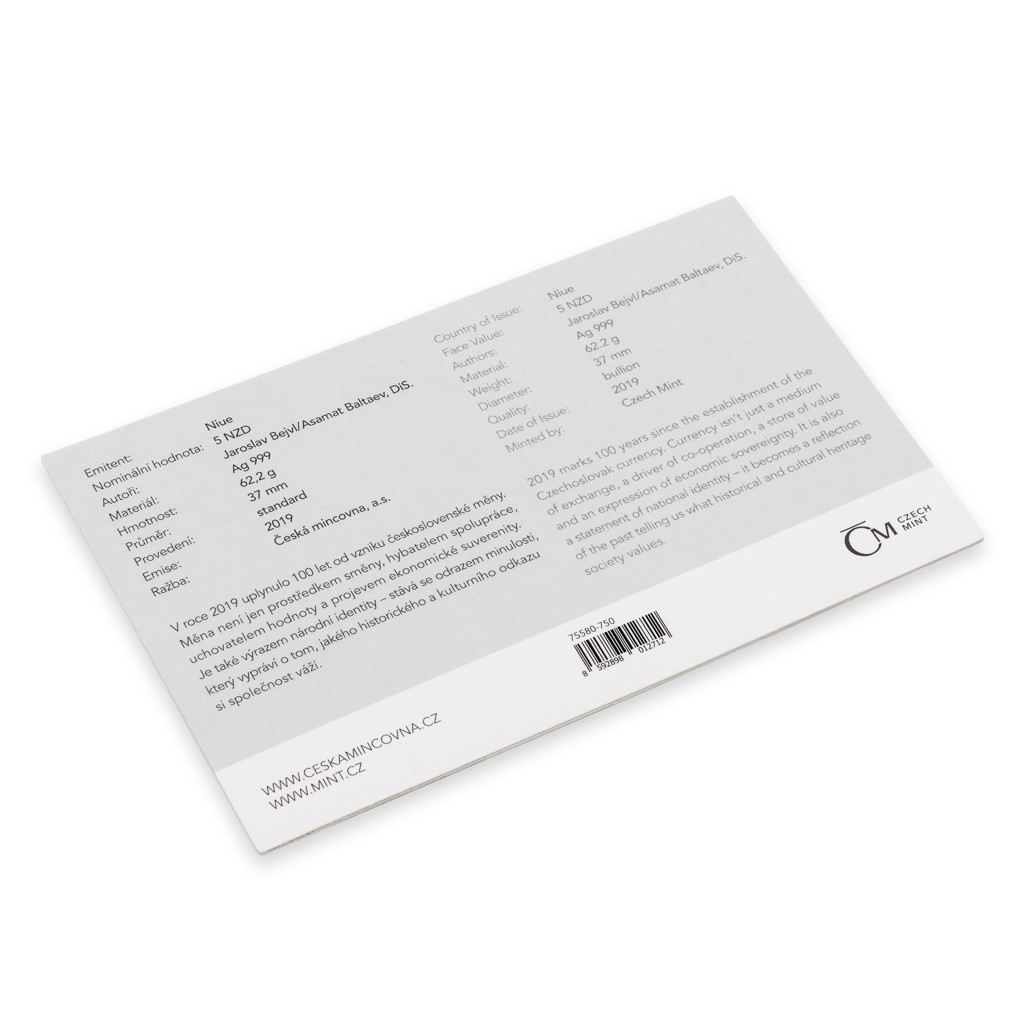 Celkový emisní náklad mince čítá 5000 kusů – 500 kusů je uloženo do speciálního číslovaného balení, které připomíná, že rok 2019 je rokem 100. výročí vzniku československé měny. Dalších 4470 kusů je k dispozici samostatně v ochranné kapsli a zbývajících 30 kusů jako součást sady vysokohmotnostních stříbrných mincí.