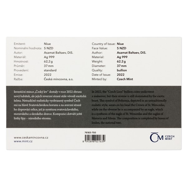 Světové investiční mince bývají věnovány silným národním symbolům a ani „Český lev“, který je první ražbou svého druhu určenou pro český trh, není výjimkou. Stříbrná mince České mincovny s ročníkem 2022, jejíž hmotnost činí dvě trojské unce, je vyražena v neobvyklém provedení piedfort – to znamená, že oproti tradičním ražbám má dvojnásobnou tloušťku.