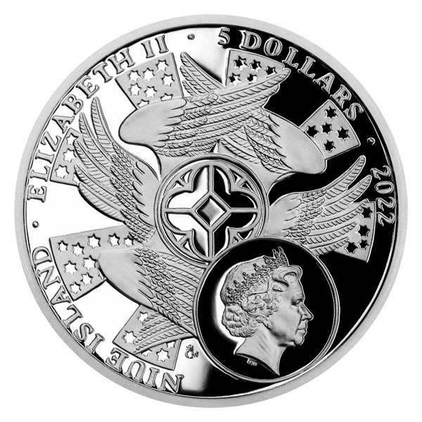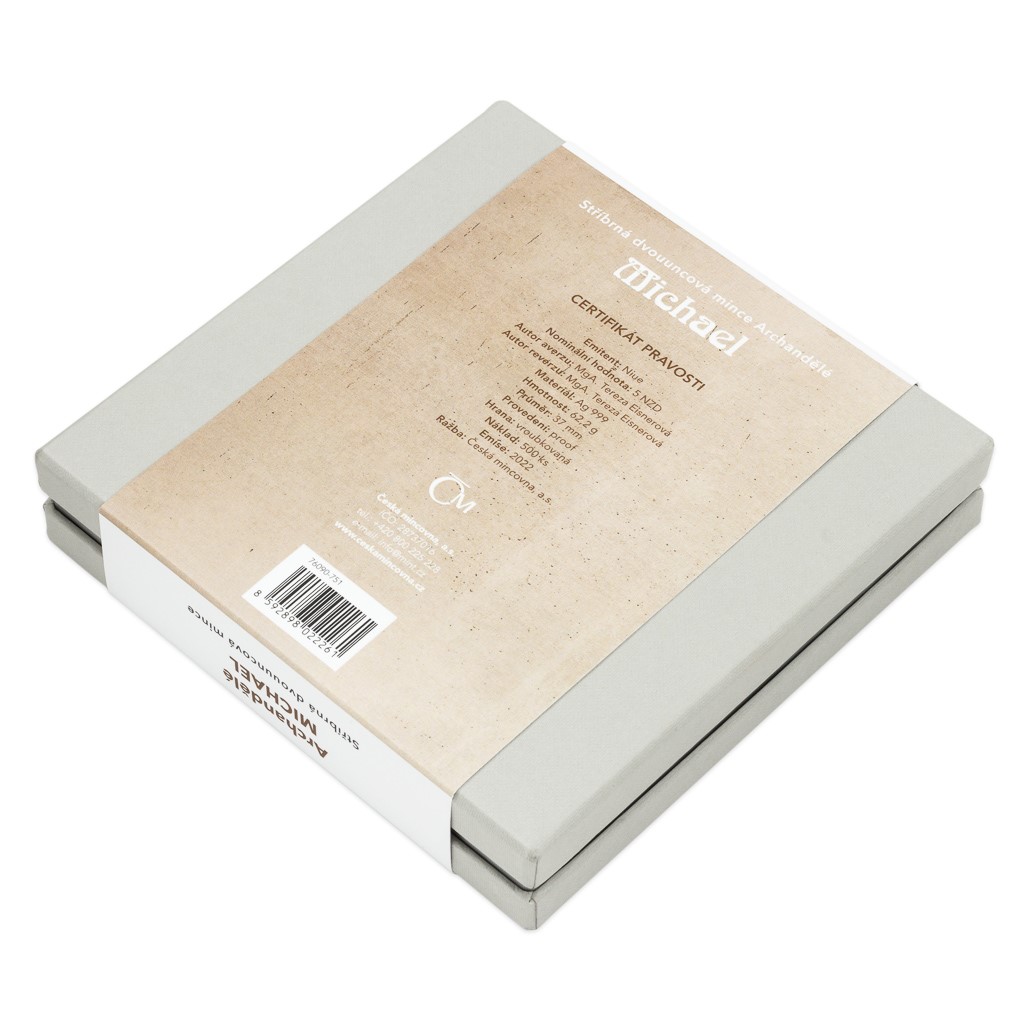Reverzní strana mince, která je dílem medailérky MgA. Terezy Eisnerové, předkládá charakteristické vyobrazení Michaela. Archanděl, který má v jedné ruce váhy a ve druhé kopí, vítězí nad poraženým ďáblem. Tento výjev odkazuje na pasáž ze Zjevení svatého Jana: „A strhla se bitva na nebi: Michael a jeho andělé se utkali s drakem. Drak i jeho andělé bojovali, ale nezvítězili, a nebylo již pro ně místa v nebi. A veliký drak, ten dávný had, zvaný ďábel a satan, který sváděl celý svět, byl svržen na zem a s ním i jeho andělé.“ Na averzní straně mince najdete chrámové okno obklopené perutěmi a zářícími paprsky. Protože licenci k vydávání pamětních mincí České mincovny poskytuje tichomořský ostrov Niue, nese averz ještě jeho nezbytné atributy – jméno a portrét královny Alžběty II., nominální hodnotu 5 DOLLARS (NZD) a rok vydání 2022.