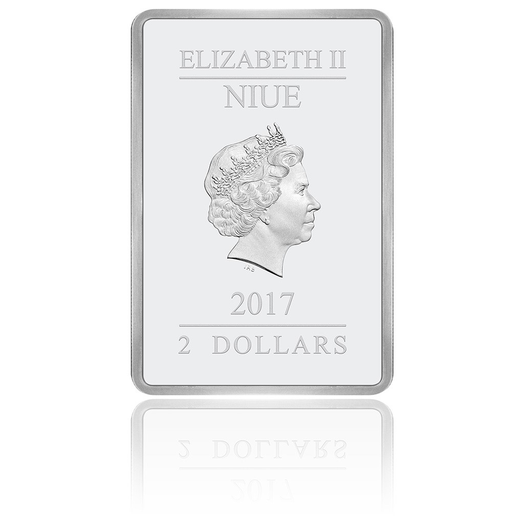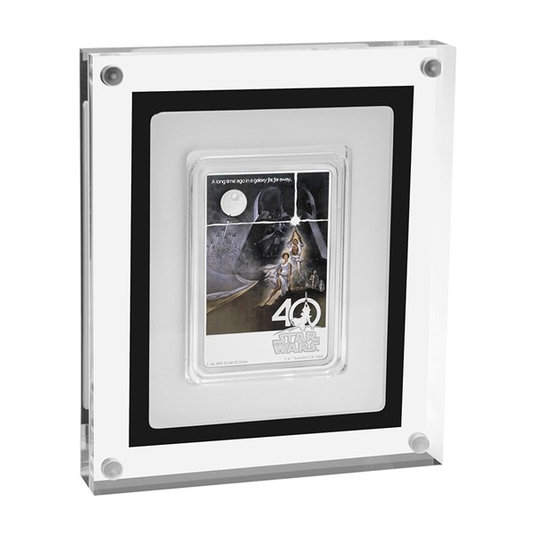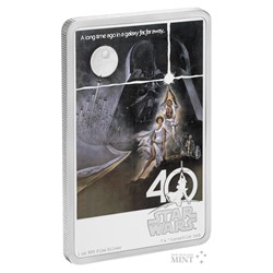 Reverzní strana netradiční obdélníkové mince má podobu původního filmového plakátu. V atraktivním kolorování, které doplňuje reliéf, se vyjímají oblíbené postavy – Luke Skywalker, princezna Leia, C-3PO, R2-D2 a Darth Vader. Na pozadí je patrná ještě letka stíhaček X-Wing, které míří k Hvězdě smrti. Kompozici uzavírá ikonický slogan „A long time ago in a galaxy far, far away…“ spolu s oficiálním logem oslav 40. výročí uvedení Star Wars do kin. Averzní strana mince pak nese atributy jejího emitenta, kterým je tichomořský ostrov Niue: jméno a portrét královny Alžběty II., letopočet vydání mince 2017 a nominální hodnotu 2 DOLLARS (NZD).