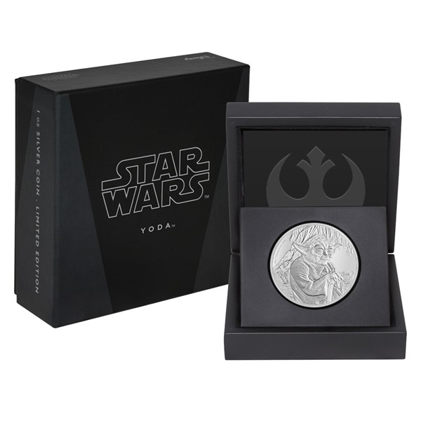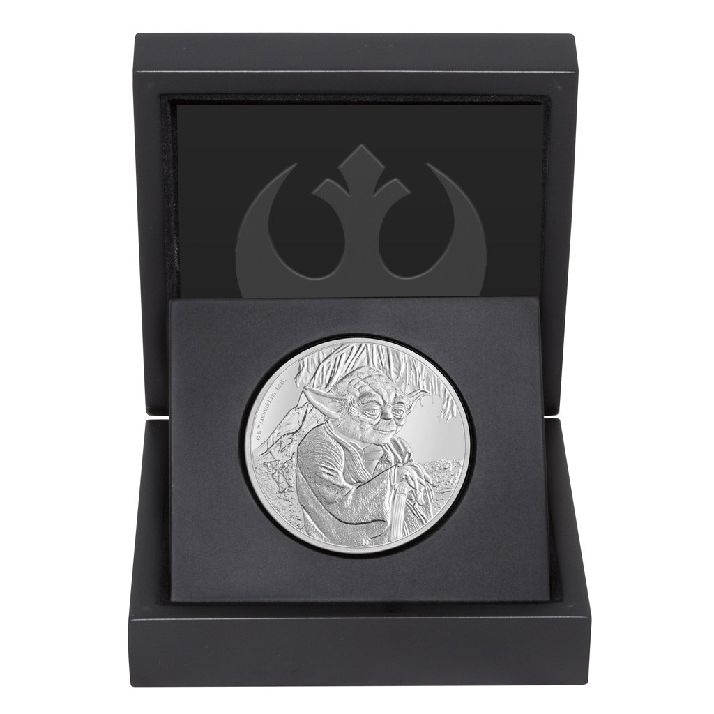 S příchodem moderní počítačové animace získal Yoda kompletní digitální kabátek, aby se na stříbrném plátně mohl zapojit do víru Klonových válek. Pro většinu fanoušků však navždy zůstane především mudrcem a poustevníkem žijícím na bažinaté planetě Dagobah, který naučil Luka Skywalkera způsobům Síly a rytířů Jedi. Právě v této roli ho zobrazuje reverz stříbrné pamětní mince. Averz je věnován atributům emitenta, kterým je novozélandský NIUE ISLAND: jménu a portrétu hlavy Commonwealthu Alžběty II., nominální hodnotě TWO DOLLARS (NZD) a roku emise 2016. Autorem výtvarného návrhu mince je designový tým New Zealand Mint.