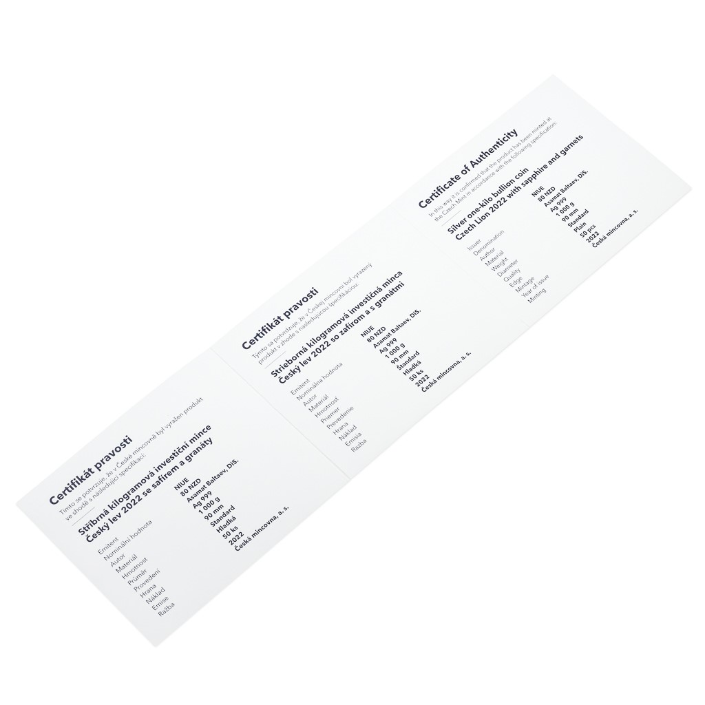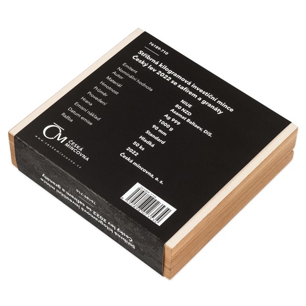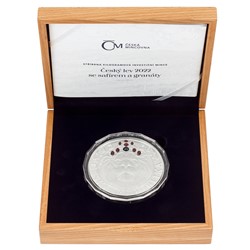 Stříbrná kilogramová investiční mince Český lev 2022 se safírem a granáty stand