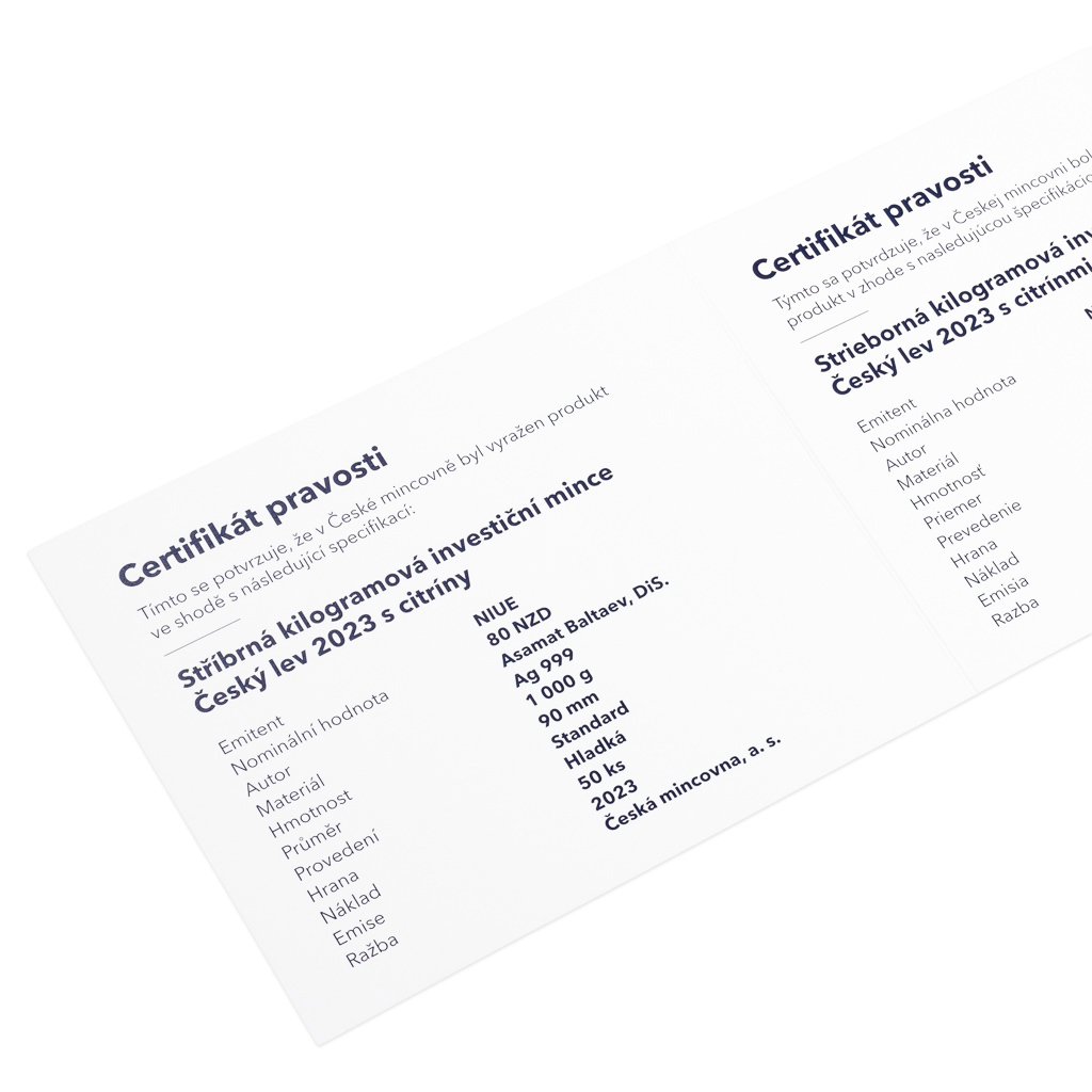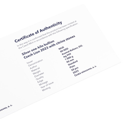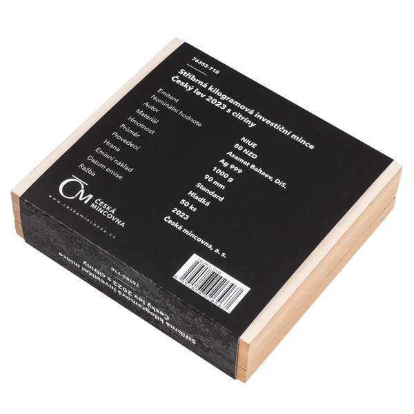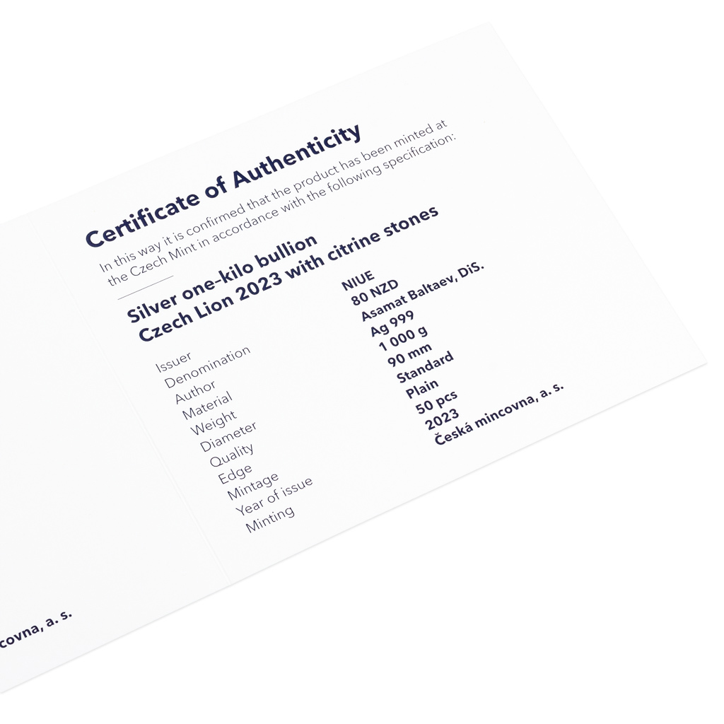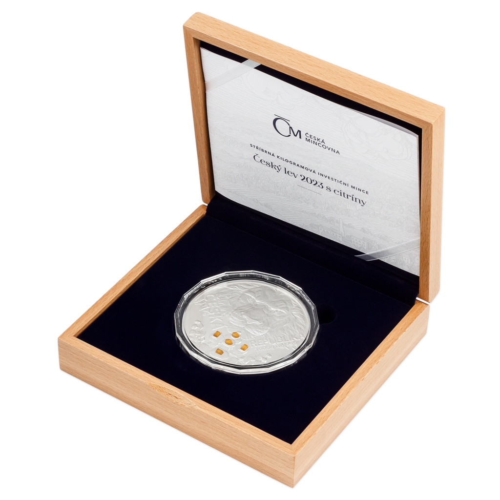 Stříbrná kilogramová investiční mince Český lev 2023 s citríny stand