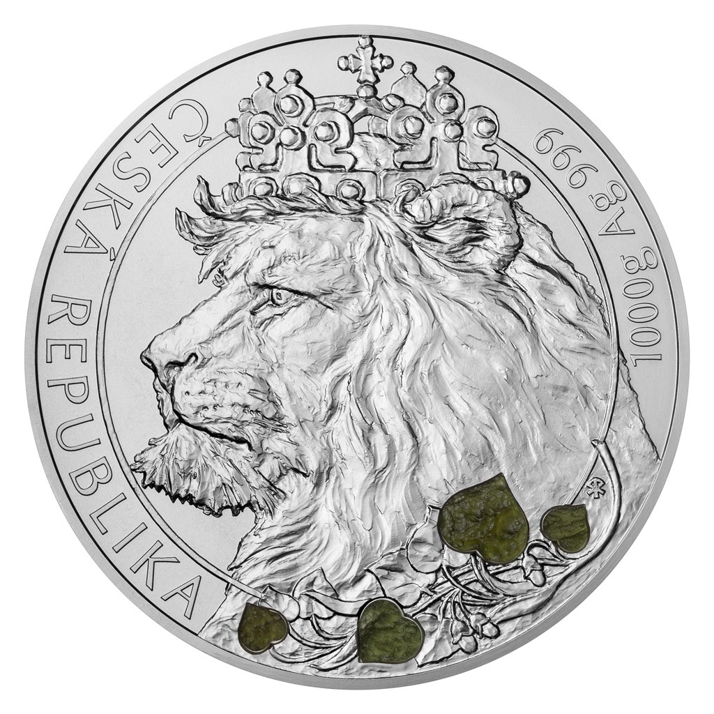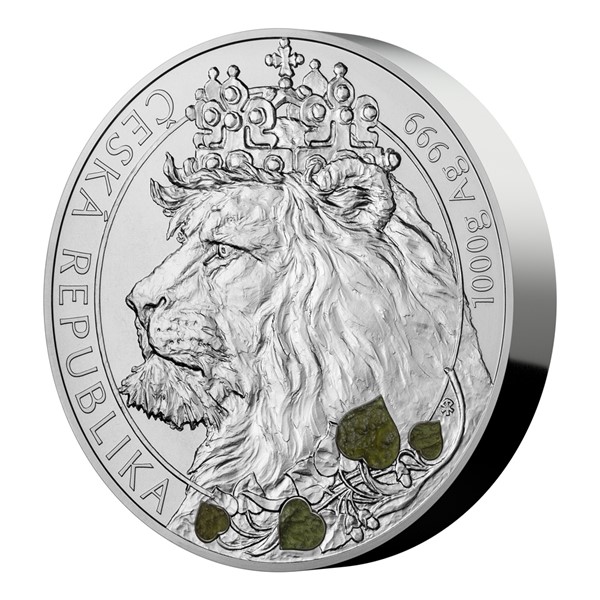 Unikátní edice investiční mince České mincovny Český lev, která je vyražena z jednoho kilogramu ryzího stříbra, je posázena vltavíny a vychází v nákladu čítajícím pouhých 40 kusů.