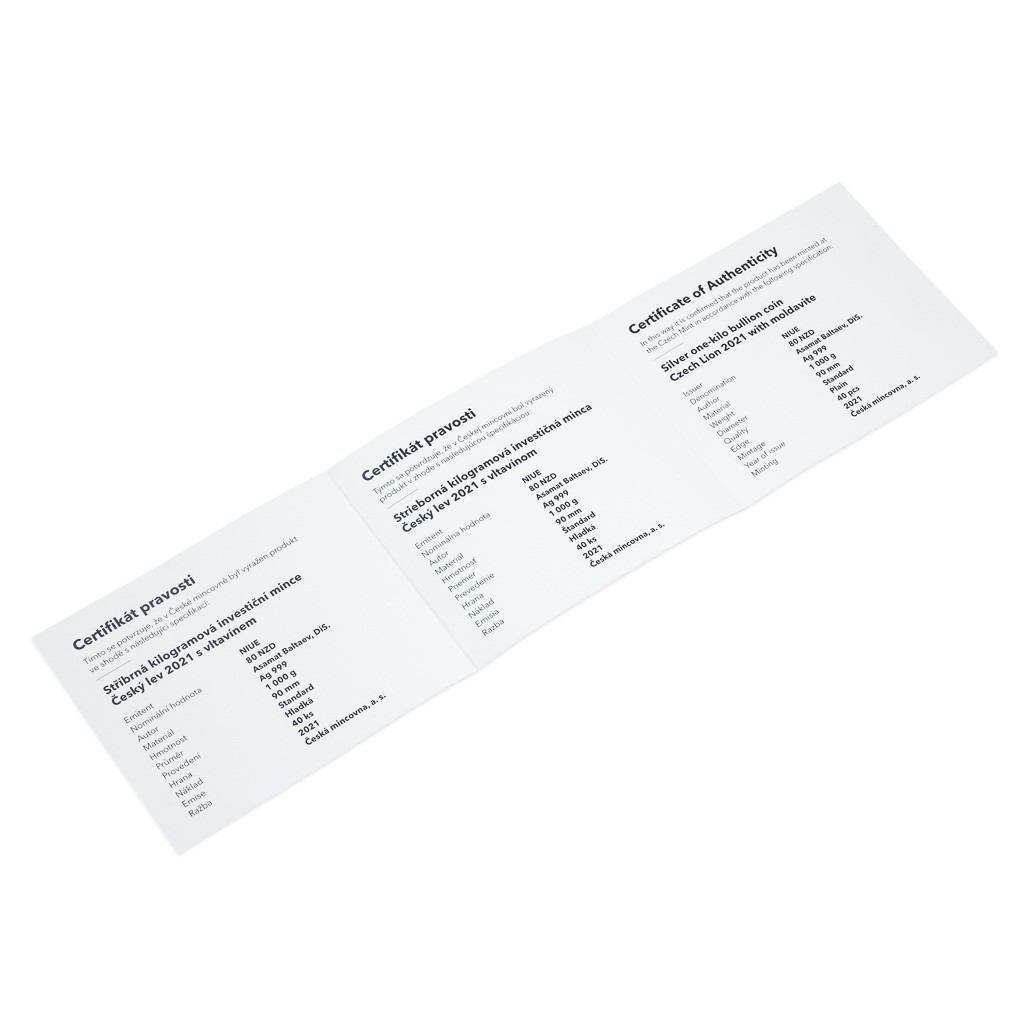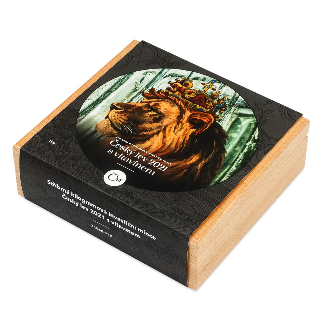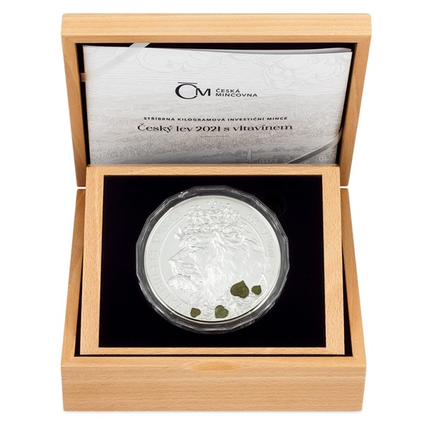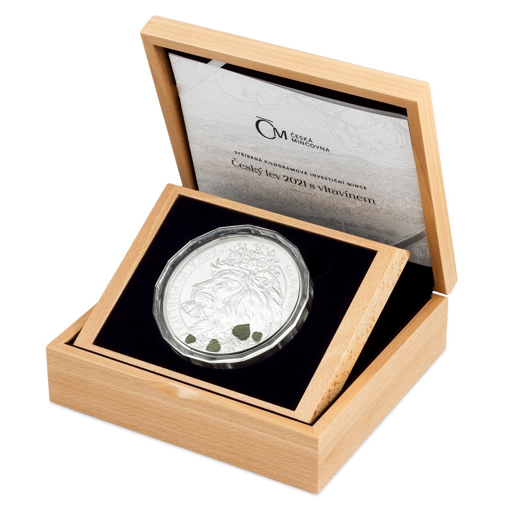 Stříbrná kilogramová investiční mince Český lev s vltavínem 2021 stand