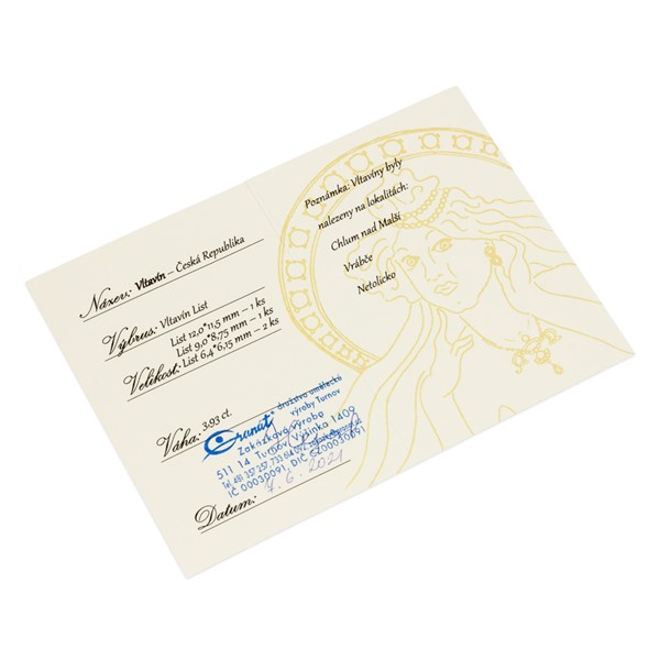 Drahé kameny, které doplňují ražený reliéf, jsou vybroušeny do tvaru lipových lístků. Pravost použitých vltavínů dosvědčuje certifikát vydaný společností Granát Turnov, který je nedílnou součástí mince.