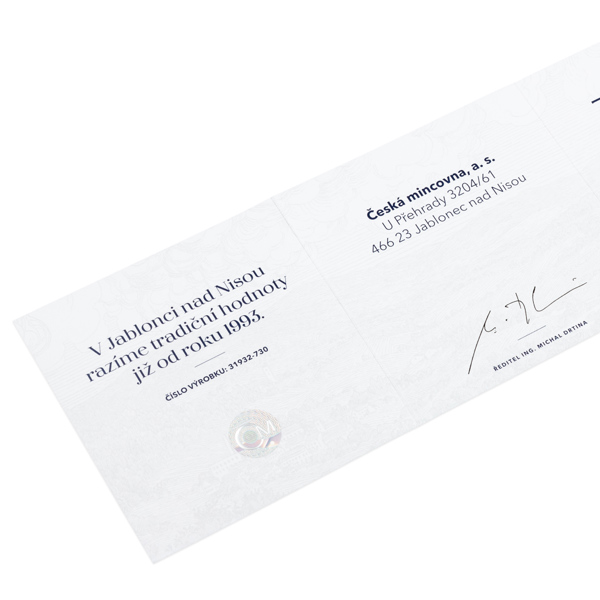 Pamětní medaile České mincovny se může pochlubit vysokým reliéfem, patinou a limitovaným nákladem, který čítá pouhých 200 kusů. Každý exemplář je ručně číslovaný na hraně.