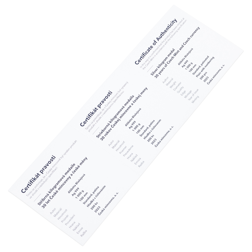 V roce 2023 uplynulo rovných 30 let od vzniku České republiky, české měny a také České mincovny. Oběžné mince se v Jablonci nad Nisou začaly razit 1. července 1993 a u příležitosti kulatého výročí tohoto okamžiku vychází mimořádná pamětní medaile vyražená z jednoho kilogramu ryzího stříbra.