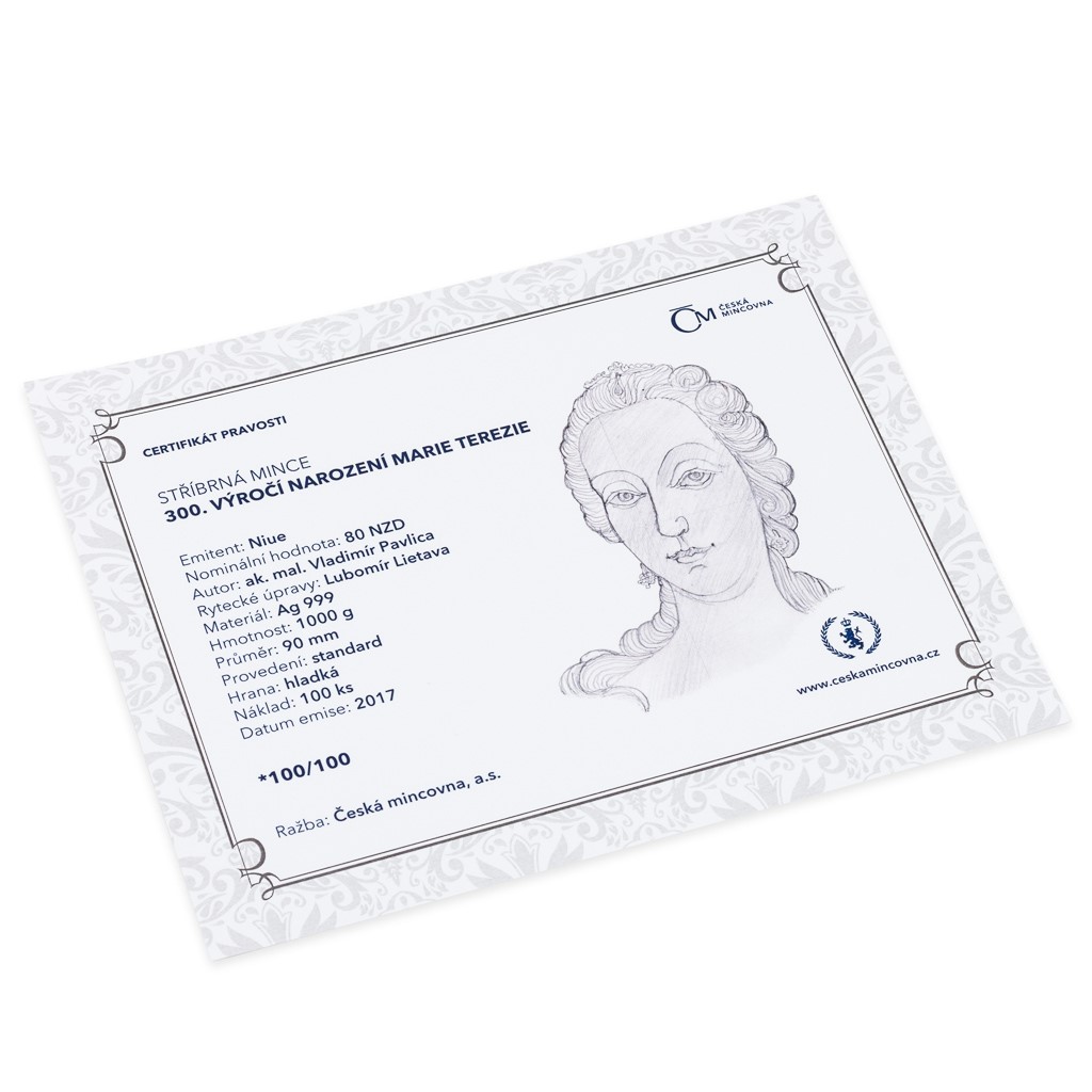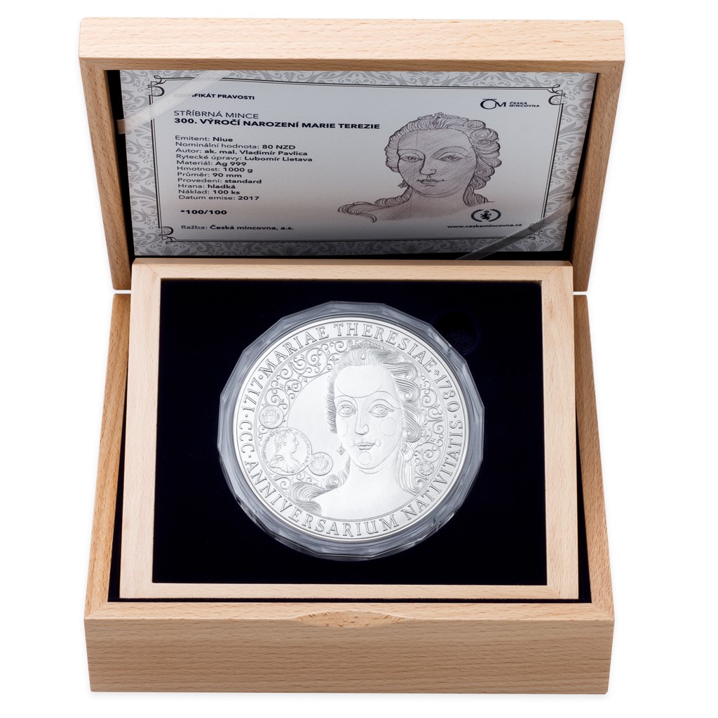 Autorem kilogramové mince se stal akademický malíř Vladimír Pavlica. Pro reverzní stranu ražby zpracoval svým nezaměnitelným rukopisem originální portrét Marie Terezie. Doplnil ho ještě jedním, menším portrétem z profilu v podobě tereziánského tolaru a obklopil ho ozdobnými ornamenty. Opis na reverzu uvádí životní letopočty panovnice 1717 a 1780 a latinský nápis CCC. ANNIVERSARIUM NATIVITATIS MARIAE THERESIAE (čili 300. výročí narození Marie Terezie). Averzní strana mince je zpracována ve stejném dekorativním stylu. Patří atributům ostrova Niue, který České mincovně poskytuje licenci k ražbě vlastních pamětních mincí – jménu a portrétu panovnice Commonwealthu Alžběty II., roku emise 2017 a nominální hodnotě 80 – EIGHTY DOLLARS (NZD). Doplňkovým motivem averzu je ještě královský monogram Alžběty II.