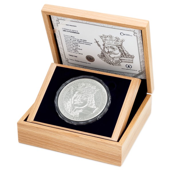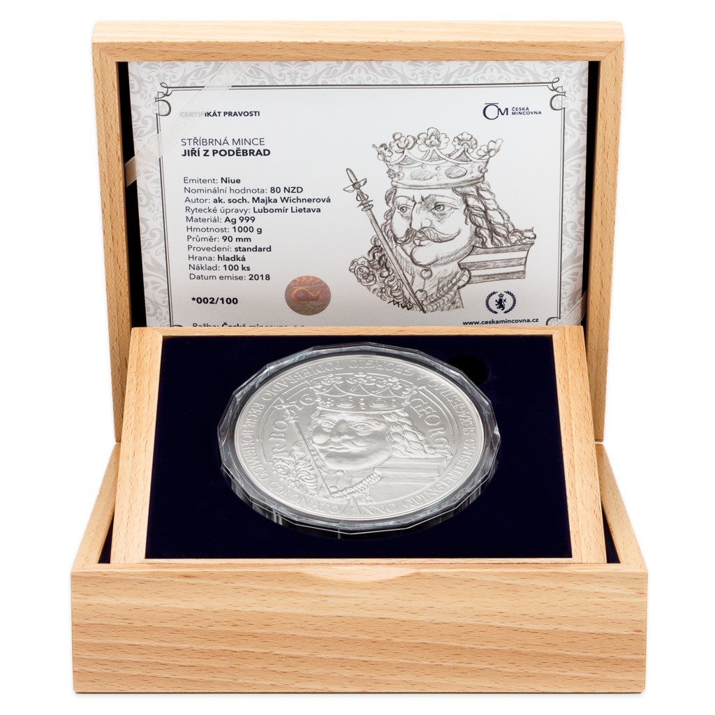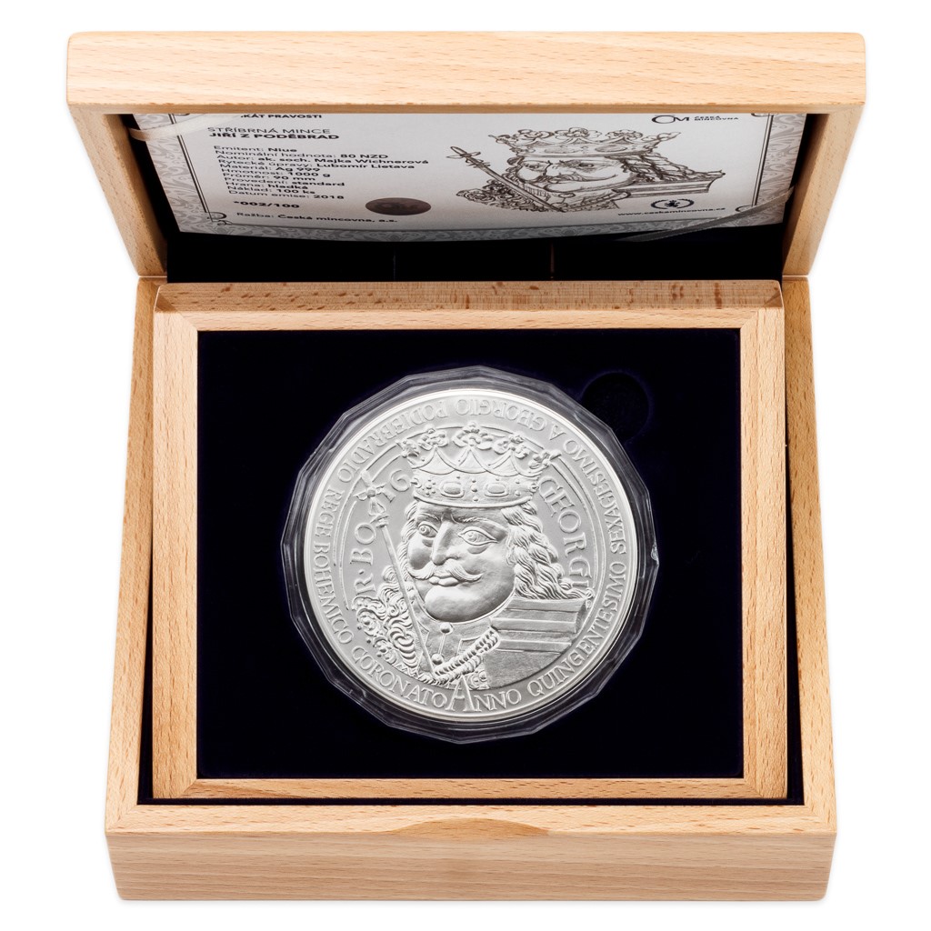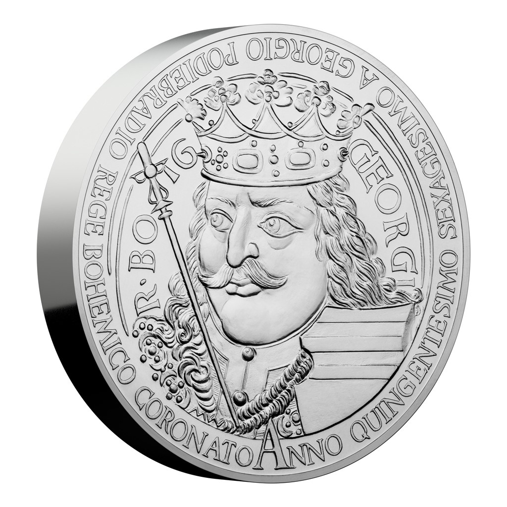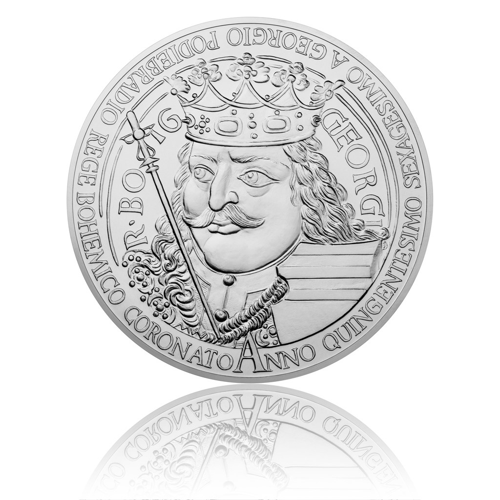 Jiří z Poděbrad byl mužem vzletných myšlenek a přelomových skutků, jediným českým monarchou, který nepocházel z panovnické dynastie, a zároveň posledním ryze českým králem. U příležitosti 560. výročí korunovace roku 1458 mu proto Česká mincovna vzdává hold majestátní mincí vyraženou z jednoho kilogramu ryzího stříbra.