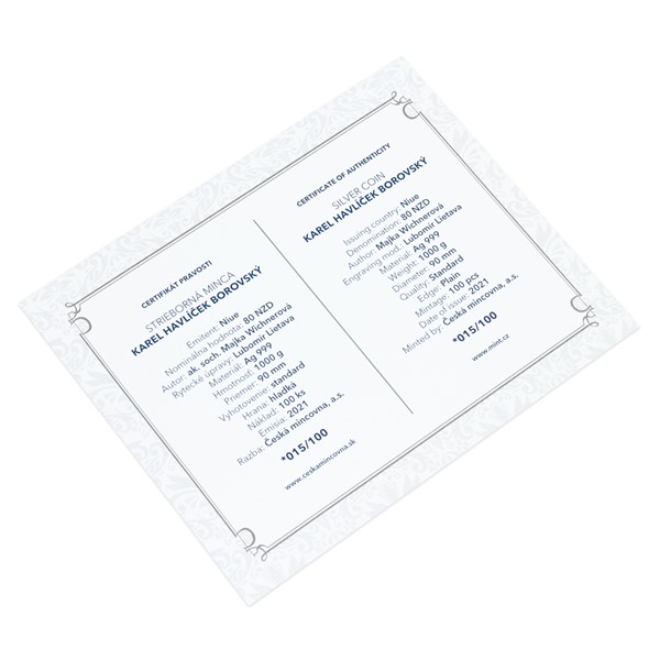 Mince je uložena do luxusní dřevěné etue a doprovází ji speciální číslovaný certifikát pravosti.