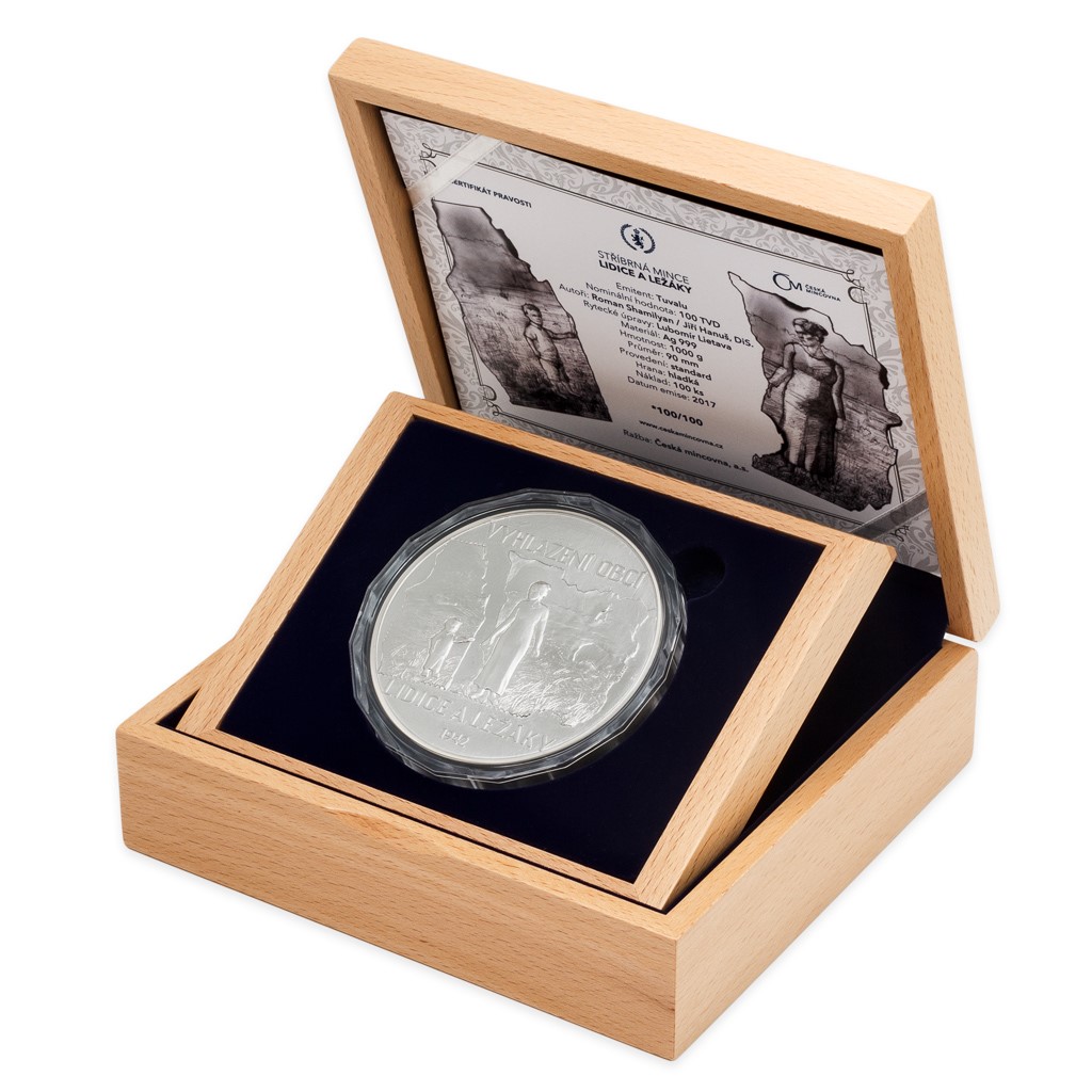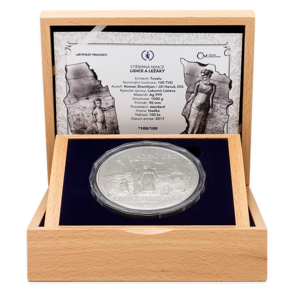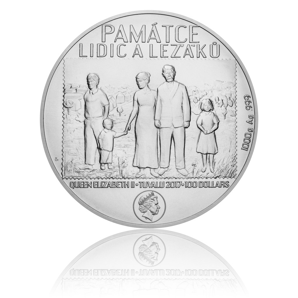 To se však nestalo a jejich oběť nesmí být nikdy zapomenuta. Dva mladí medailéři Roman Shamilyan a Jiří Hanuš, DiS., proto přišli se srdceryvnou vzpomínkou v podobě pamětní mince. Obě její strany jsou stylizovány do podoby fotografie – na averzu je na ní zachycena pětičlenná rodina; na reverzu je fotografie ohořelá, dítě je odtrženo od matky a další členové rodiny ze snímku dočista zmizeli. Symbolický výjev je doplněn texty VYHLAZENÍ OBCÍ LIDICE A LEŽÁKY, 1942 a PAMÁTCE LIDIC A LEŽÁKŮ. Averz nese ještě atributy ostrovního státu Tuvalu, který České mincovně poskytuje licenci k ražbě vlastních pamětních mincí – portrét a jméno královny Alžběty II., rok emise 2017 a nominální hodnotu 100 DOLLARS (TVD).