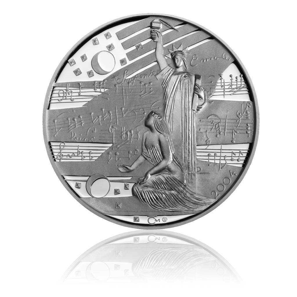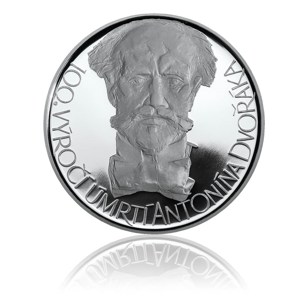 Antonín Leopold Dvořák byl jeden z nejvýznamnějších skladatelů všech dob a je světově nejproslulejším a nejhranějším českým skladatelem vůbec. Jeho symfonické opusy patří ke světové špičce a jsou obvyklou součástí všech významnějších přehlídek symfonické hudby. Síla jeho melodické invence uchvacuje dodnes odborníky i laiky a brala dech i skladatelovým současníkům (je znám Brahmsův výrok: „Dvořákova témata pro vedlejší myšlenky by mně docela stačila i na myšlenky hlavní…“). Proslavil se svými symfonickými díly a velkými vokálně-instrumentálními skladbami, neméně však i koncertními skladbami a operami. Jedná se o čelního světového představitele tzv. klasicistně-romantické syntézy. Za zmínku jistě stojí i to, že první skladba, která zazněla po přistání na Měsíci, byla Novosvětská symfonie. Nejrozsáhlejší součást jeho díla tvoří instrumentální tvorba (symfonická, komorní i sólová), stejně důležité jsou však i jeho písně, duchovní i kantátové kompozice a opery jako například Šelma sedlák, Čert a Káča, Rusalka. Velmi známé jsou jeho symfonické básně (např. Vodník, Polednice, Zlatý kolovrat, Holoubek) a Slovanské tance. Averzní strana znázorňuje bustu Antonína Dvořáka s opisem 100. výročí úmrtí Antonína Dvořáka. Dobová busta nese rysy až silně zdůrazněného sochařského zpracování. Reverzní stranu zdobí dvě stylizované ženské postavy. Stojící postava připomíná Sochu svobody s knihou a klečící postava ženskou náruč. Mincovní pole je zdobeno notovými osnovami ze symfonie E moll. Limitovaná emise 1000 kusů.