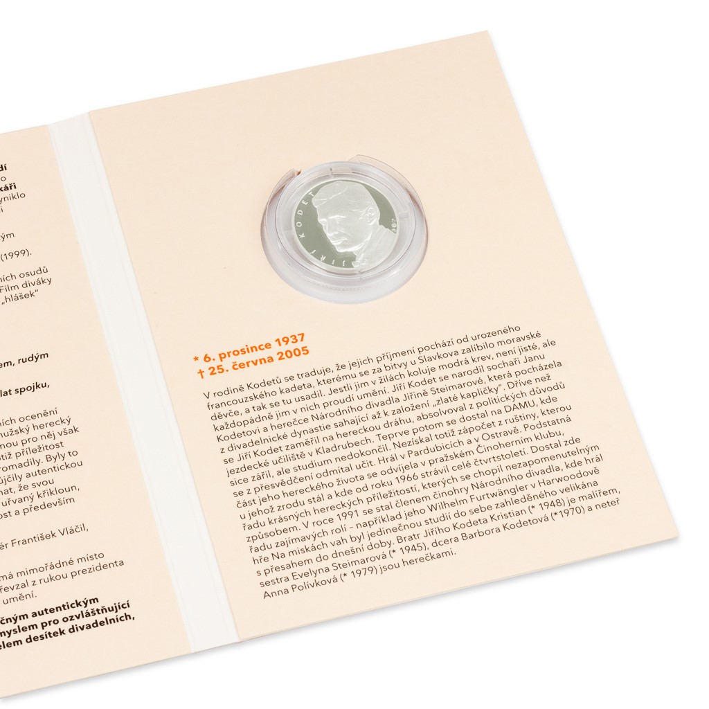 Volný cyklus České mincovny Hvězdy stříbrného plátna skládá hold velikánům české kinematografie, a to příhodně prostřednictvím stříbrných pamětních medailí. Po Karlu Fialovi, Rudolfu Hrušínském a Vladimíru Menšíkovi rozšiřuje přehlídku charismatických umělců Jiří Kodet.