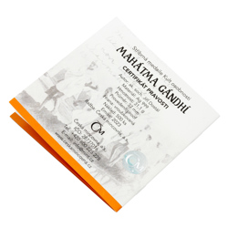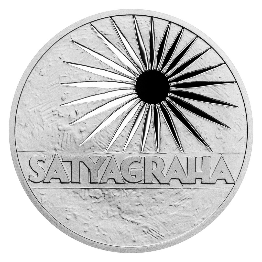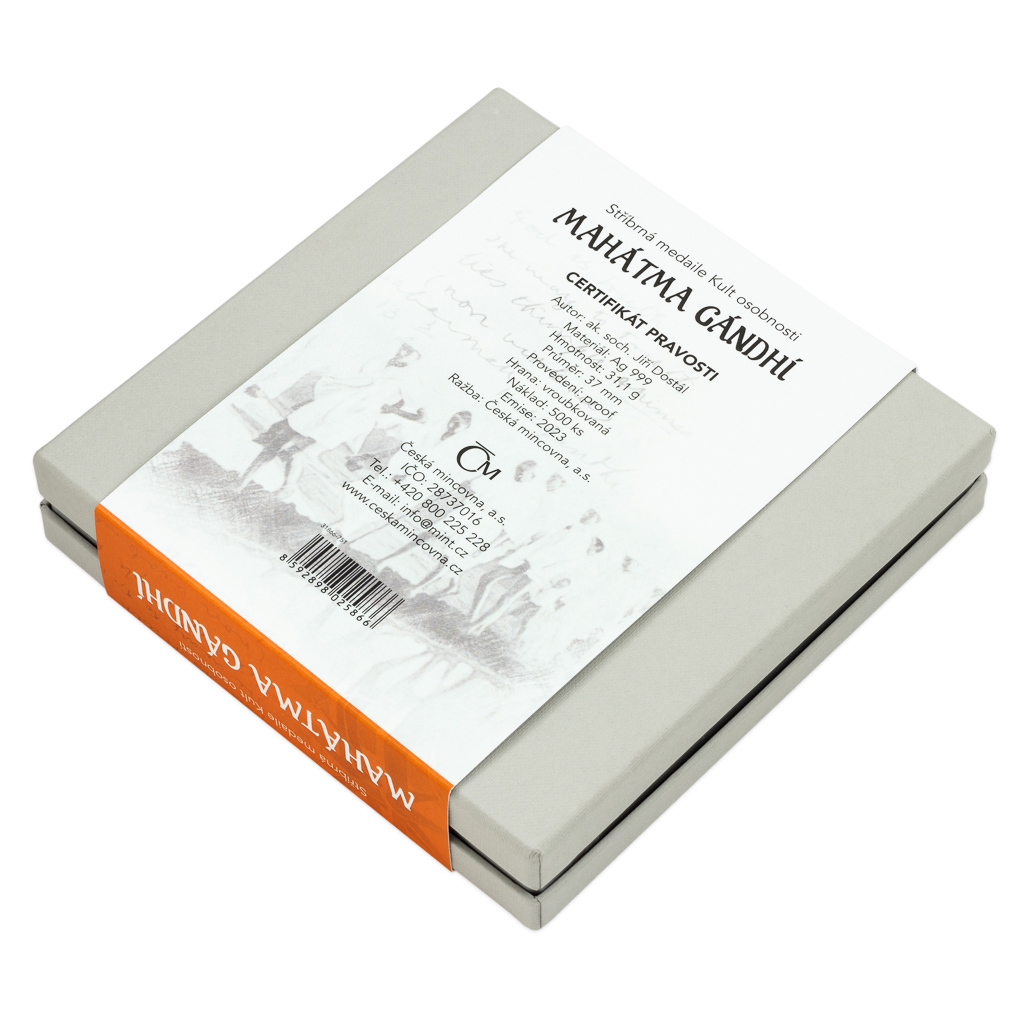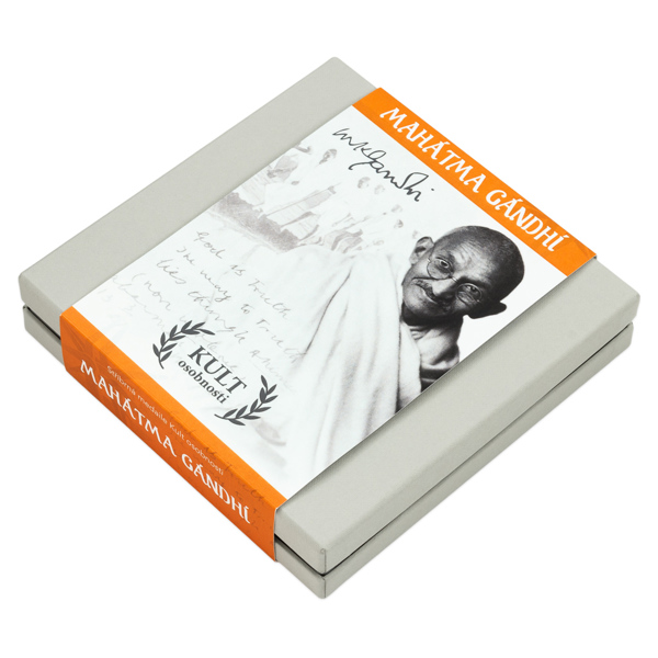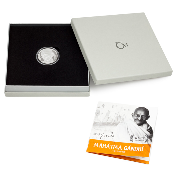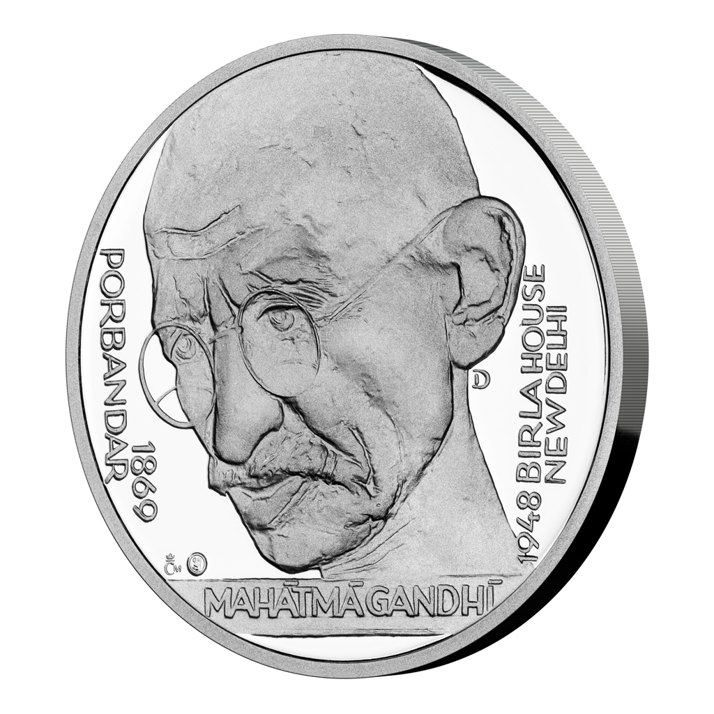 Na páté stříbrné medaili České mincovny z cyklu s názvem Kult osobnosti se objevuje obdivovaná postava Mahátmy Gándhího.