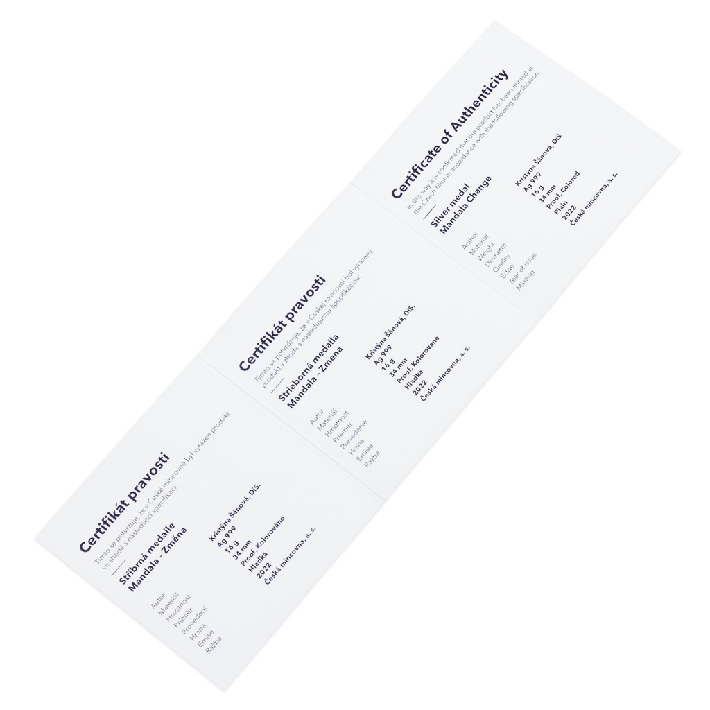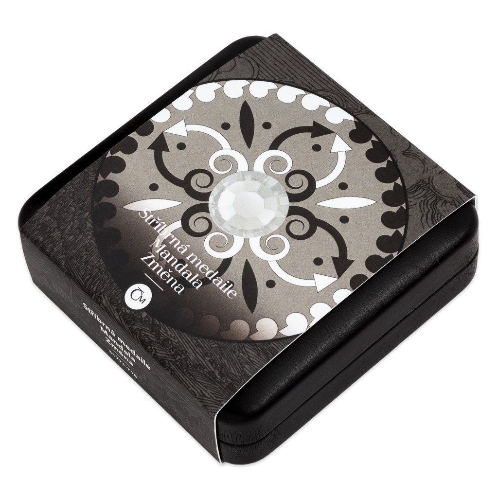 Slovo mandala pochází ze staroindického sanskrtu a lze ho přeložit jednoduše jako kruh. Jeho význam už ale tak jednoduchý není – představuje nekonečno, dokonalost, rovnováhu, jednotu, … Mandaly mají podobu kruhového obrazce se středem, z něhož – či do něhož – směřují symetricky uspořádané tvary. Vedle tvarů, které symbolizují mužskou energii, obsahují mandaly také barvy, které zastupují energii ženskou. Barvy proto nesmějí chybět ani na stříbrných medailích. Síla každé mandaly je schovaná v jejím středu, kde všechno začíná i končí, a tak je doprostřed medaile vsazen skleněný kámen. Přestože si lidé spojují mandaly především s civilizacemi jižní Asie, jejich variace se vyskytují napříč časem, kulturami i náboženskými a filozofickými systémy – stačí se podívat na okna evropských katedrál nebo na lapače snů amerických Indiánů. Představují nástroj pro relaxaci, meditaci a sebepoznání, ale také pro řešení problémů či plnění přání. Protože největším problémem je pro mnoho lidí změna, stala se motivem osmé dárkové mandaly České mincovny.