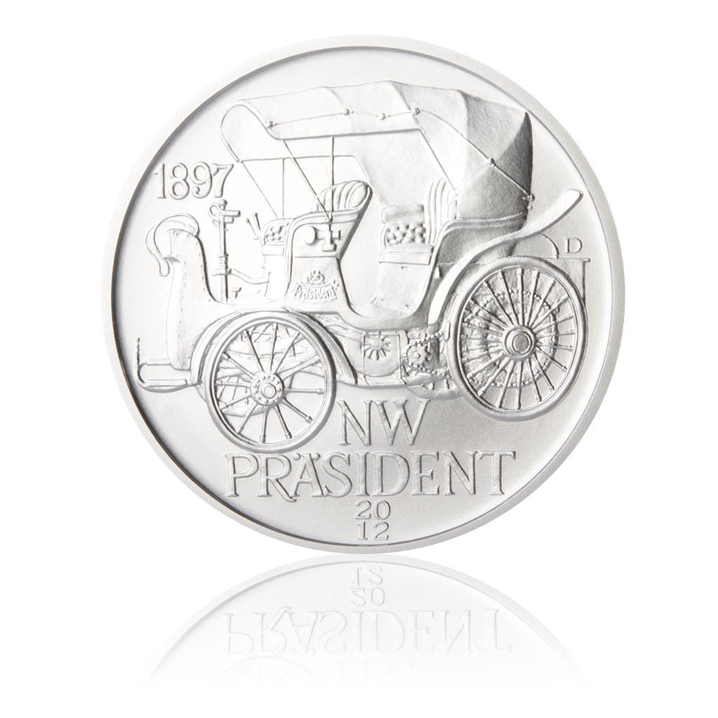 Památného roku 1897 byla v Kopřivnici zahájena výroba automobilů. K tomuto historickému úspěchu však vedla cesta téměř půl století dlouhá. Ignatz Schustala, nejmladší syn z rodiny kopřivnických dědičných fojtů, se vyučil sedlářskému řemeslu a zkušenosti vyrazil sbírat do Vídně. Po návratu ze zkušené získal živnostenské oprávnění ke stavbě kočárů a začal vyrábět bryčky Neutitscheinka. Jeho firma se rok od roku rozrůstala a kolem roku 1870 zaměstnávala již téměř 150 dělníků. V roce 1882 se dokonce pustil do výroby železničních vagónů. Na konci století využil ředitel továrny Hugo Fischer přátelských vztahů s libereckým průkopníkem automobilismu baronem Theodorem Liebigem. Získal pro továrnu jeden z prvních dvouválcových motorů Benz, který se stal základem prvního kopřivnického automobilu Präsident. Ten vycházel z kočárů Mylord. Už ho však nepoháněla koňská síla, ale spalovací motor. Konstrukce se tak musela razantně změnit. Na voze najdeme novinky, například kovaný nárazník chránící před nárazem kondenzátor chladicího systému nebo třeba diferenciál. Po absolvování zkoušek odjel Präsident po vlastní ose na výstavu do Vídeňského Prátru. Bezproblémová jízda trvala čtrnáct a půl hodiny čistého času. Ve Vídni byl vůz vystaven na čestném místě, stal se totiž prvním továrně vyrobeným automobilem tehdejší monarchie. Na averzní straně je v centru kompozice vyobrazen automobil z mírného tříčtvrtečního pohledu, v řádku nápis NW Präsident a nad ním v řádce letopočet výroby automobilu. Na reverzní straně najdeme v opisu text "HISTORIE MOTORISMU V ČESKÝCH ZEMÍCH“, který je reliéfně mírně vyklenutý, aby vytvářel dojem pneumatiky. V centru kompozice jsou paprsky inspirované volantem, v podkladu kružnice symbolizující rotaci.