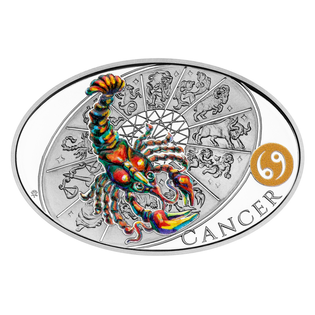 Medaile netradičního oválného tvaru nese na averzní straně kolorované vyobrazení Raka. Jako předloha pro kolorování nebyly použity fotografie nebo počítačová grafika – medailér Asamat Baltaev, DiS., vytvořil originální akvarelovou malbu. Reliéf v pozadí předkládá disk s tuctem znamení zvěrokruhu a kompozici dotváří ještě latinský opis CANCER s příslušným astrologickým symbolem. Hvězdné symboly jednotlivých znamení najdete i na reverzní straně medaile, která je společná celé sérii.