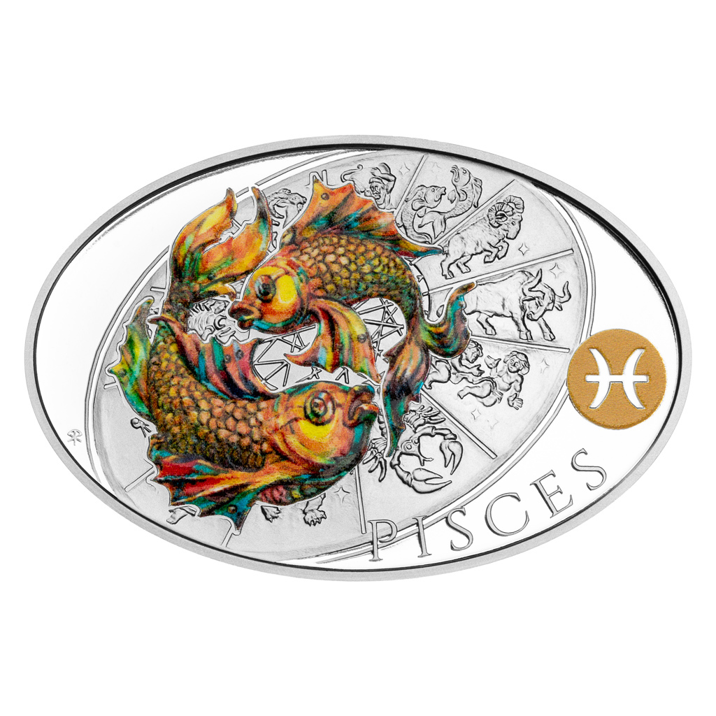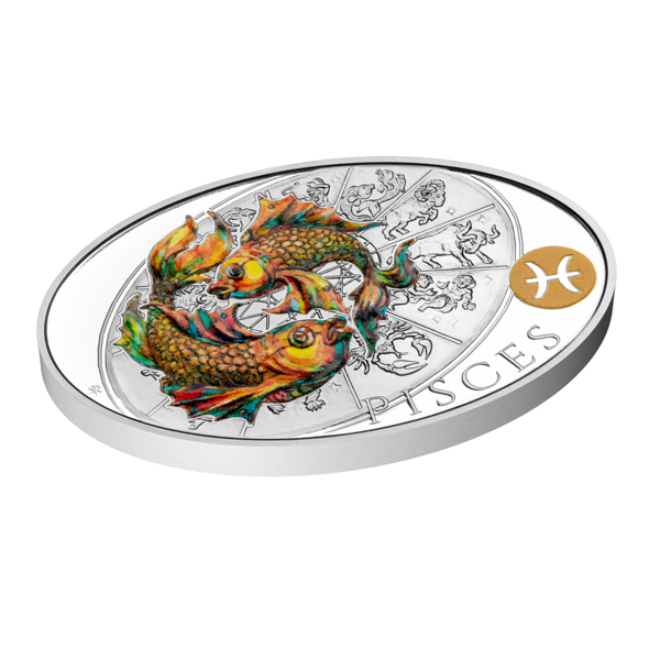 Stříbrná medaile České mincovny z dárkové série s motivy 12 znamení zvěrokruhu se stane nejen krásným, ale také hodnotným talismanem pro každého, kdo se narodil ve znamení Ryb.