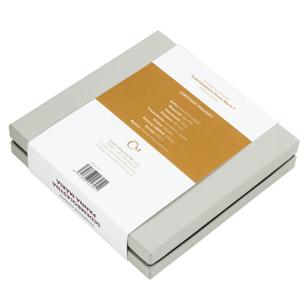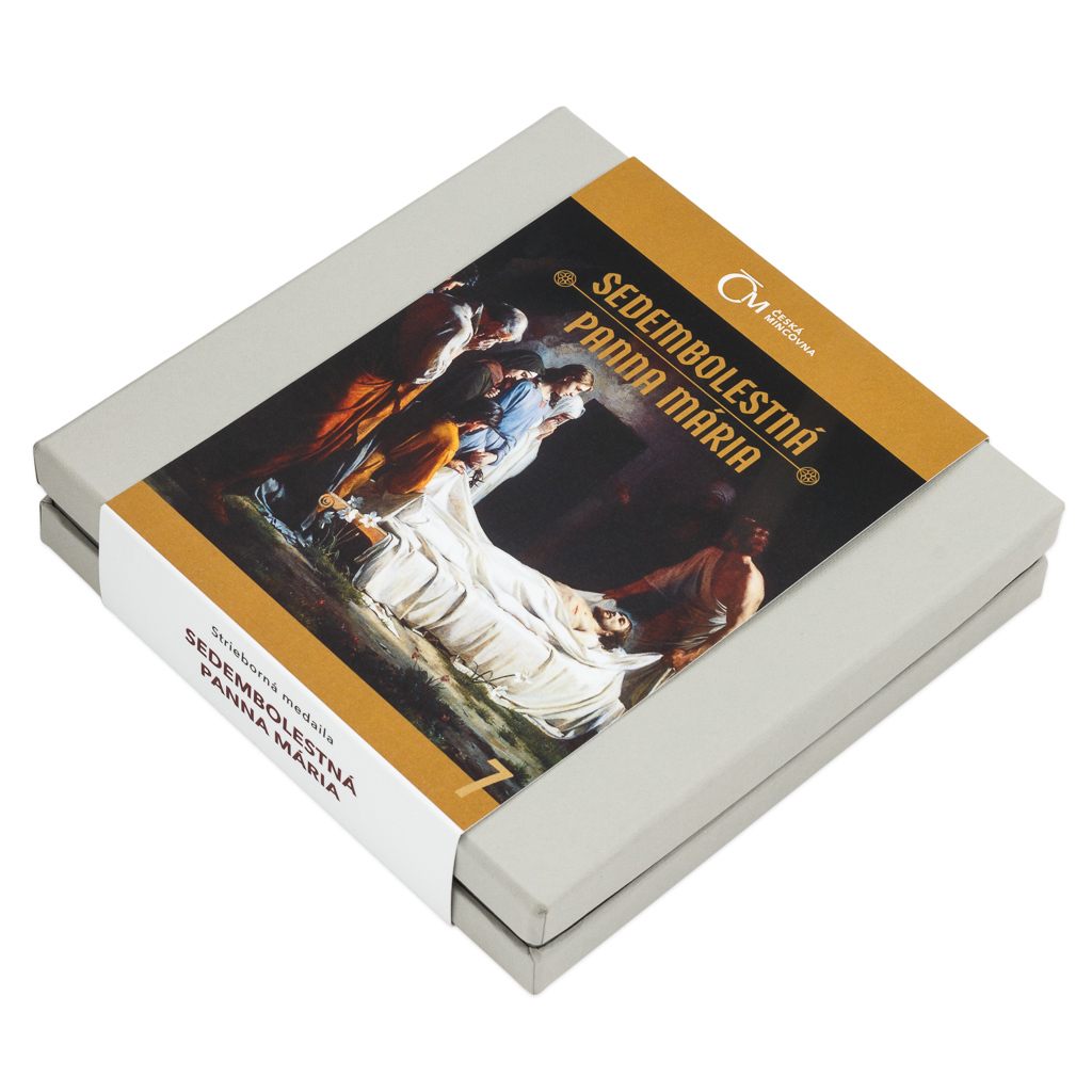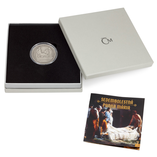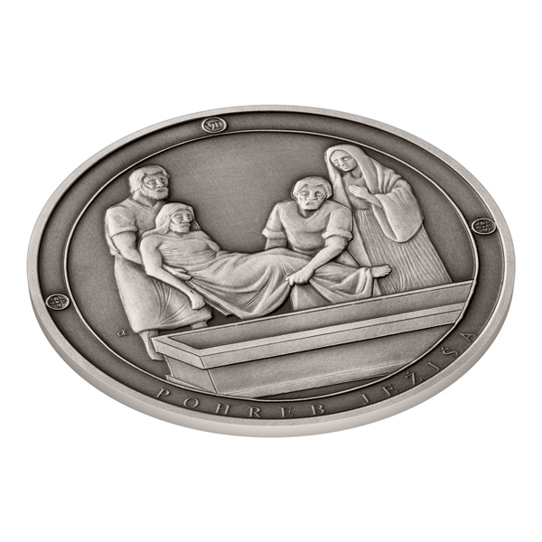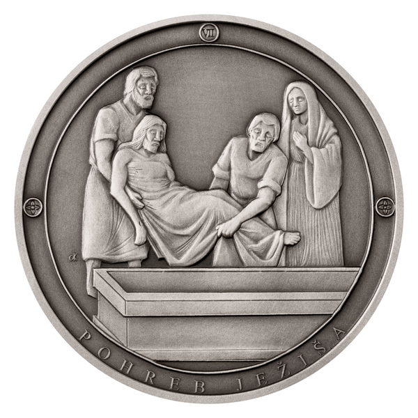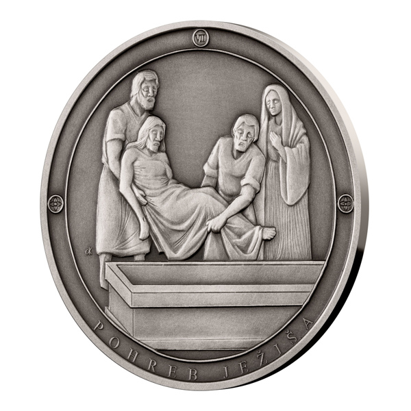 Sedmá stříbrná medaile České mincovny ze slovenského cyklu, který zve k rozjímání o událostech, jimiž bylo poznamenáno neposkvrněné srdce Panny Marie Sedmibolestné, připomíná Ježíšův pohřeb.