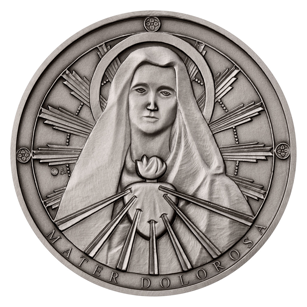 Na averzní straně pamětní medaile, která je dílem medailéra Davida Kružliaka, je zvěčněna scéna Ježíšova pohřbu. Marie přihlíží tomu, jak je bezvládné tělo jejího syna vkládáno do hrobu. Reverzní straně, která je společná celému cyklu, pak vévodí bysta Panny Marie. Jejích sedm bolestí je vyjádřeno prostřednictvím srdce probodnutého sedmi meči.