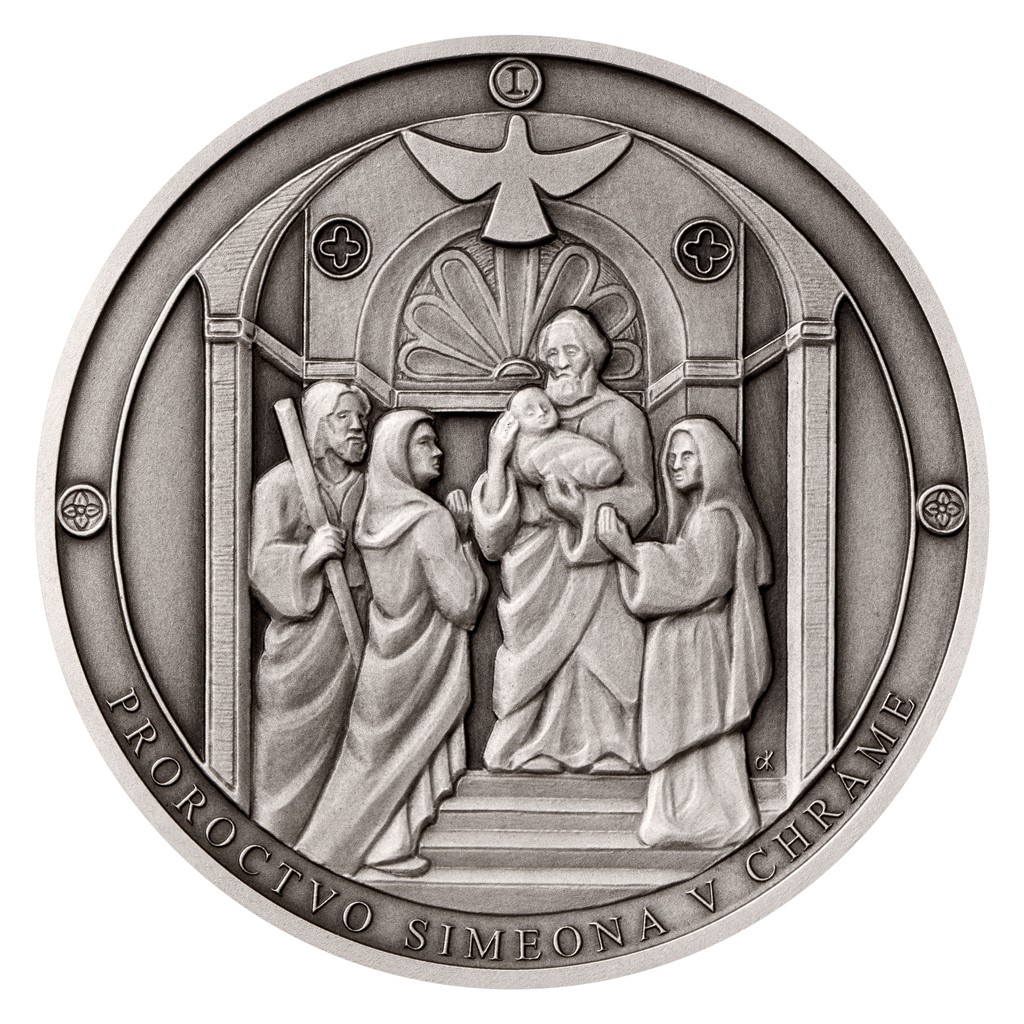 Na averzní straně pamětní medaile, která je dílem medailéra Davida Kružliaka, je zvěčněna scéna z jeruzalémského chrámu. Simeon drží malého Ježíška a Marie s Josefem přihlížejí osudovému proroctví. Reverzní straně, která je společná celému cyklu, vévodí bysta Panny Marie. Jejích sedm bolestí je vyjádřeno prostřednictvím srdce probodnutého sedmi meči.