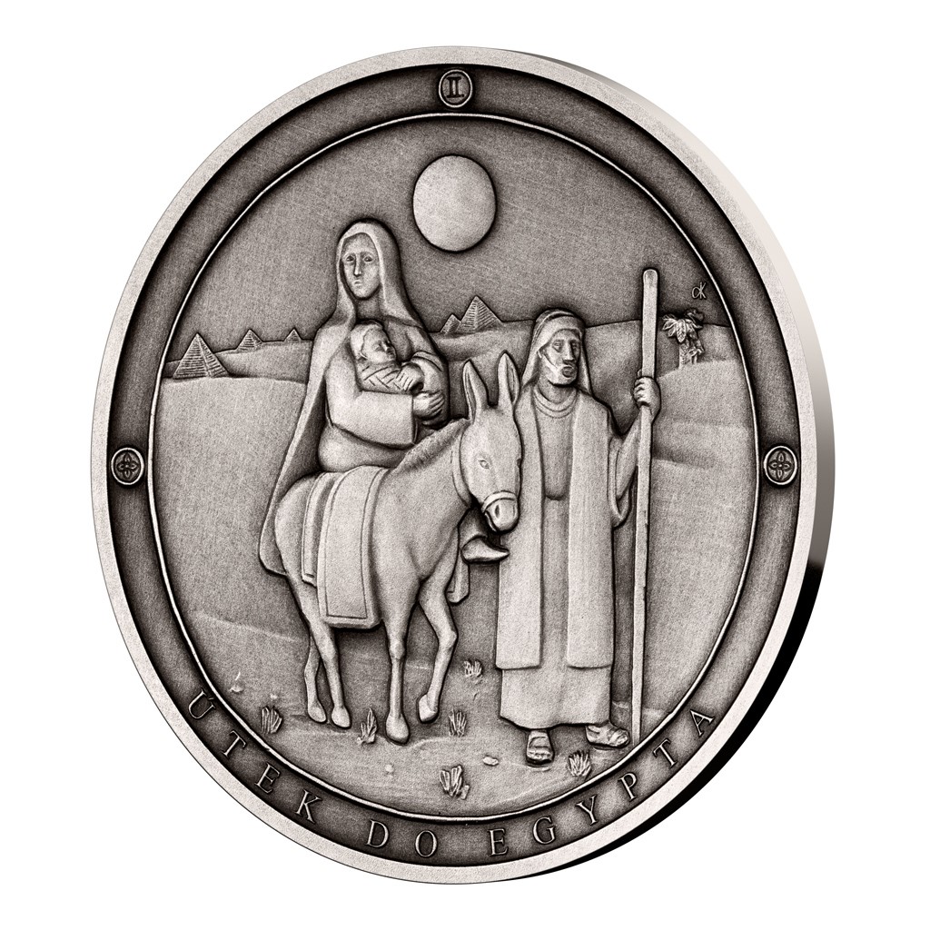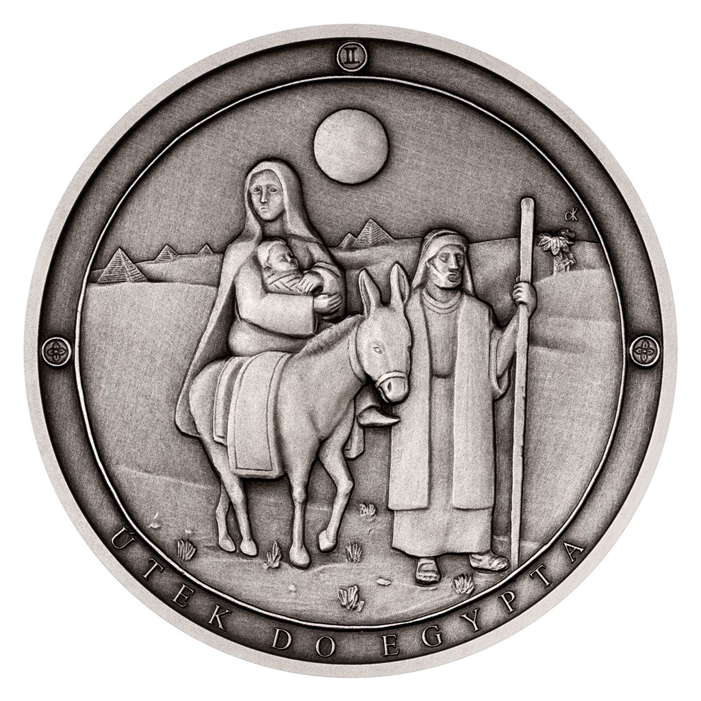 Druhá stříbrná medaile České mincovny z cyklu, který zve k rozjímání o událostech, jimiž bylo poznamenáno neposkvrněné srdce Panny Marie Sedmibolestné, připomíná útěk do Egypta.