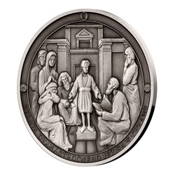 Třetí stříbrná medaile České mincovny z cyklu, který zve k rozjímání o událostech, jimiž bylo poznamenáno neposkvrněné srdce Panny Marie Sedmibolestné, připomíná ztrátu Ježíše v chrámu.