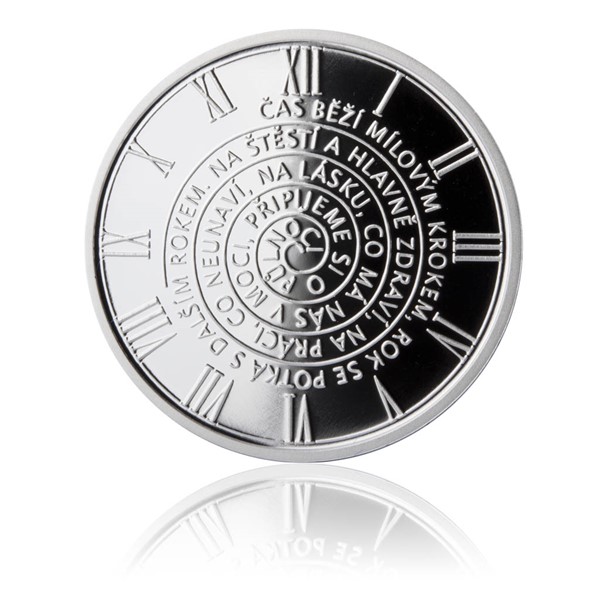 Stříbrná novoročenka ve tvaru mince.