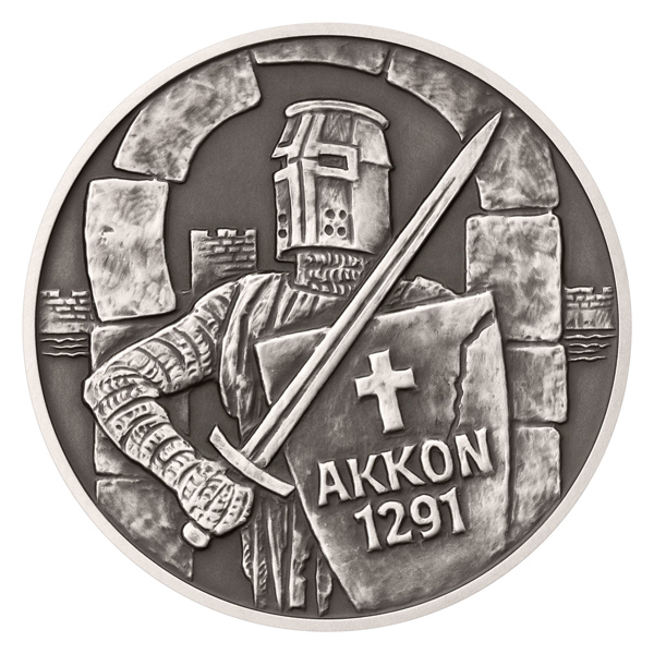 Při závěrečné obraně Akkonu roku 1291 do jednoho padli všichni němečtí rytíři, kteří ho hájili,“ dodává autor medaile. Reliéf je zvýrazněný patinou.