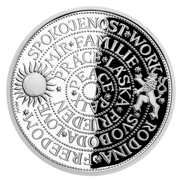 SPOKOJENOST, MÍR, LÁSKA, SVOBODA, RODINA, PRÁCE – to jsou slova, která si se štěstím spojuje autorka medaile ak. soch. Majka Wichnerová. Věnovala jim reverzní stranu pamětní medaile, doplnila je cizojazyčným překladem, dvouocasým českým lvem a sluncem. Motiv slunce vévodí také averzní straně – mezi jeho paprsky je zasazeno slovo ŠTĚSTÍ v sedmi jazycích.
