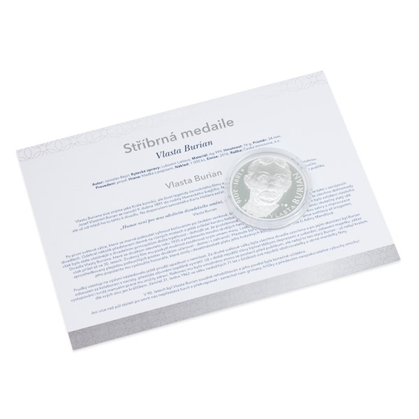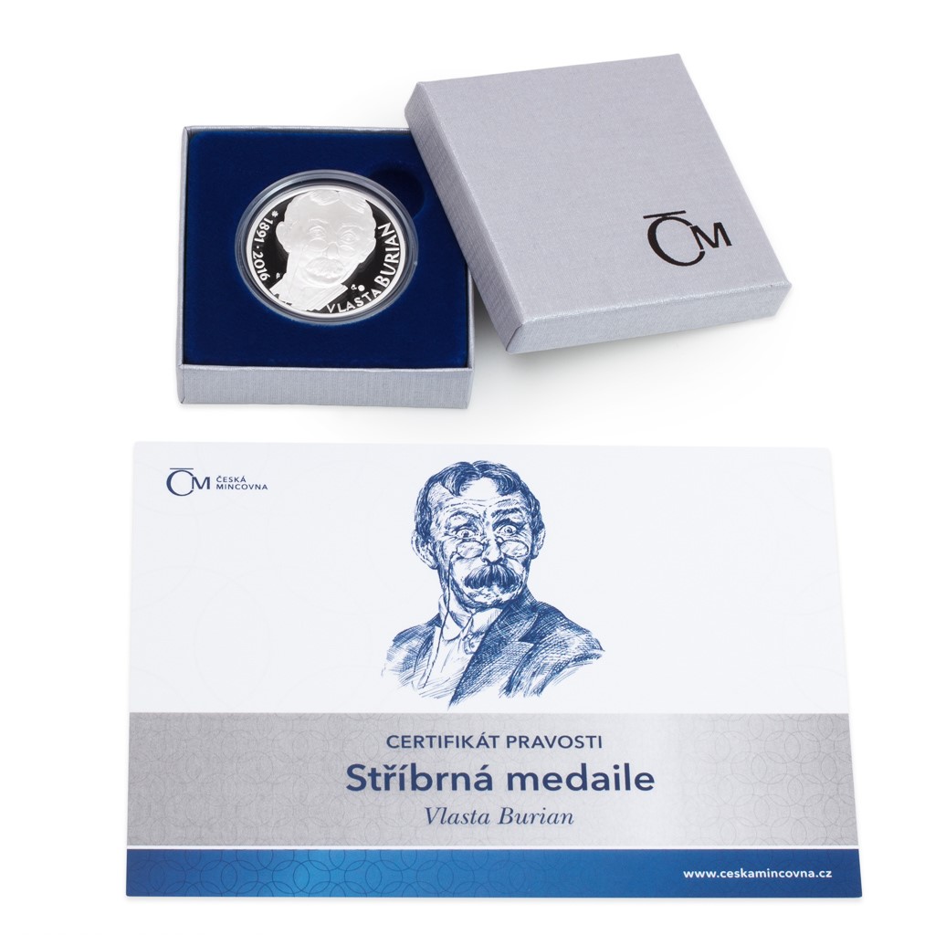 Stříbrné pamětní medaile Vlasty Buriana jsou náhradou za zrušenou emisi České národní banky a vycházejí z vítězného soutěžního návrhu. Doplňuje je ilustrovaný certifikát pravosti s tematickým textem.