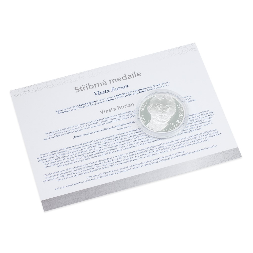 Divákům ale Vlasta Burian navždy utkvěl v paměti jako živel s neskutečně pestrými výrazovými prostředky. Obličej se zdviženým obočím a vykulenýma očima se stal hercovým nezaměnitelným gestem, které medailér Jaroslav Bejvl mistrovsky zachytil na averzu nové pamětní ražby z ryzího stříbra. Umělcovu podobiznu po stranách doplnil daty 1981 a 2016 a také jménem VLASTA BURIAN. Reverz medaile vtipně vyzdobil motivem filmového pásu, do jehož okének umístil písmena tvořící text FILMOVÝ HEREC a KOMIK. Dalším vkusným prvkem rubové strany je umělcův plastický podpis. Nádherná stříbrná pocta „králi komiků“ se stane hýčkaným klenotem vašich sbírek!